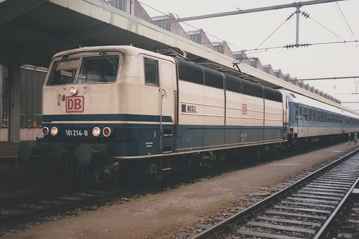 Scanbild: am 4 Augustus 1997 steht DB 181 214 mit ein IR nach Nordeich Mole abfahrtbereit in LUxembourg. Die 181er soll jedoch nür bis KOblenz Hbf am Zug bleiben.