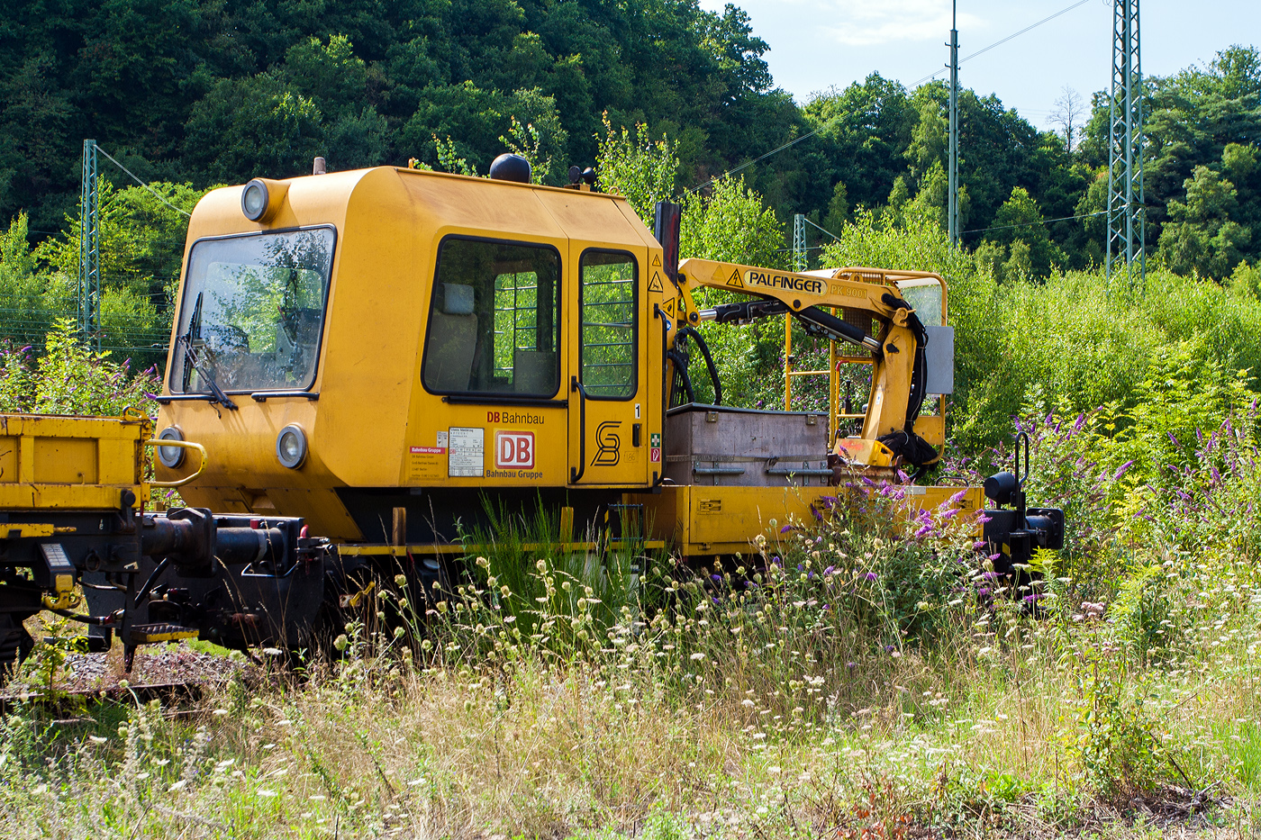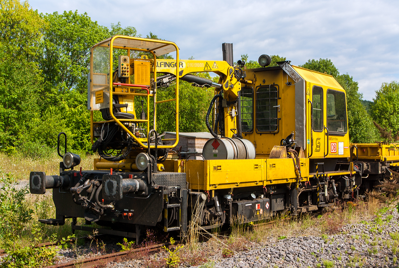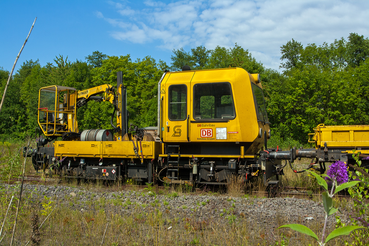 Der LINSINGER Rail milling train MG31 (LINMAG Schienenfräszug MG 31), Schweres Nebenfahrzeug Nr. D-DB 99 80 9427 009-2, der DB Bahnbau Gruppe GmbH steht am 26 Mai 2024 in Opladen. Aufnahme aus einem Zug heraus.