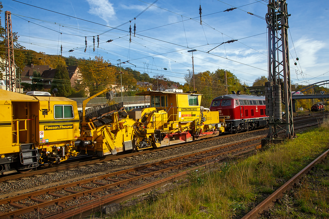 Die 277 031-1 (MaK G 1700 BB-2) der Schweerbau (bzw. eingestellt bei LDS) mit einem Zug von Materialförder- und Siloeinheiten MFS 100, der Schweerbau, hier abgestellt am 13.07.2013 in Betzdorf/Sieg.