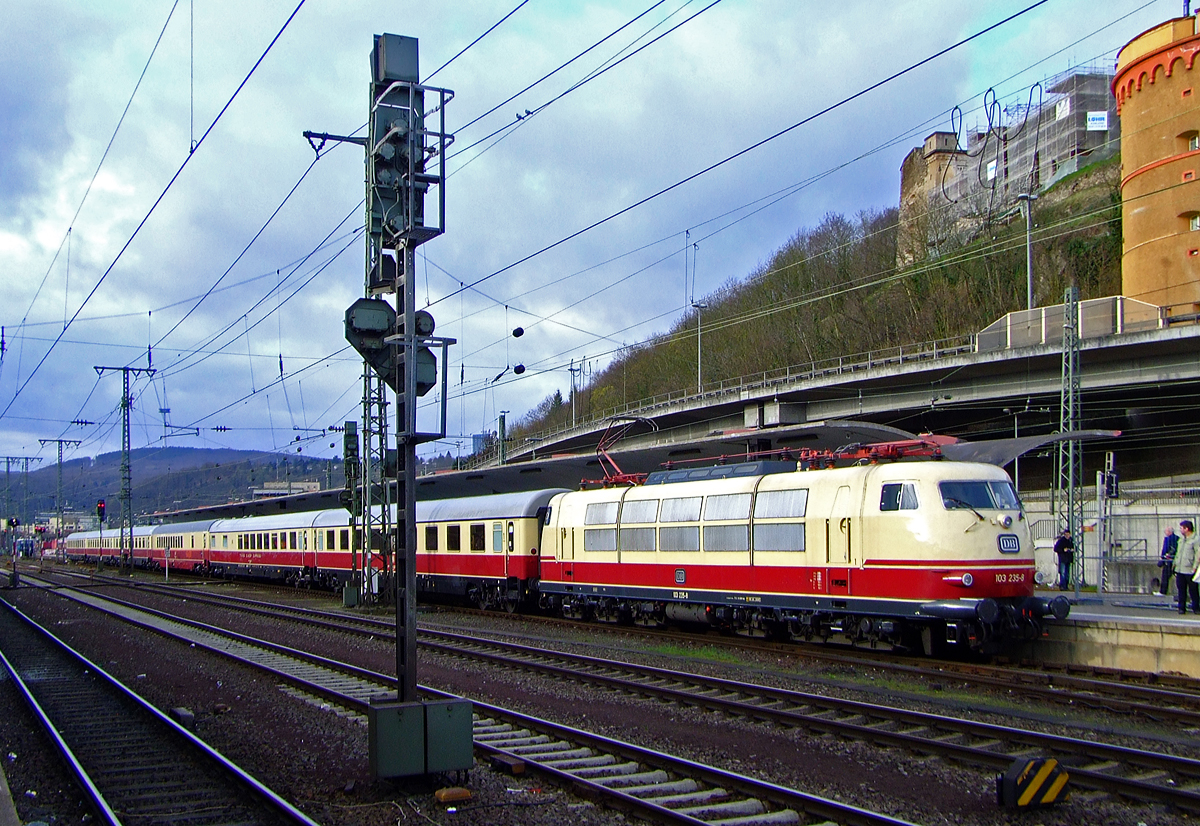 Die 103 235-8 (91 80 6103 235-8 D-DB) mit IC 91300 (mit TEE-Rheingold Wagen) steht am 03.04.2010 im Koblenzer Hauptbahnhof zur Weiterfahrt nach Trier Hbf bereit. Der Zug fuhr anlässlich des Dampfspektakels 2010. Der Sonderzug fuhr als TEE Rheingold die Verbindung Dortmund – Essen – Duisburg – Köln – Koblenz – Trier. Den Zug konnte man mit einem normalen IC-Ticket in der 2. Klasse buchen.