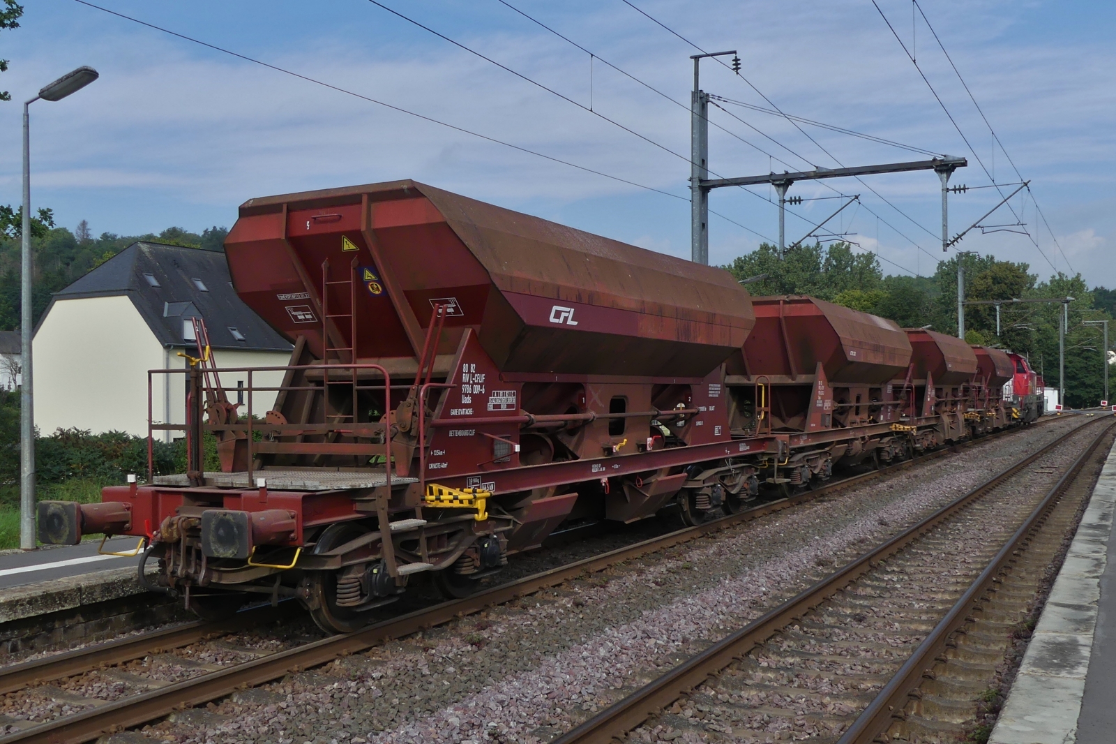 CFL DE 18 310 steht mit gefüllten Schotterwagen der Gattung Uads am Bahnsteig in Drauffelt. 29.08.2023