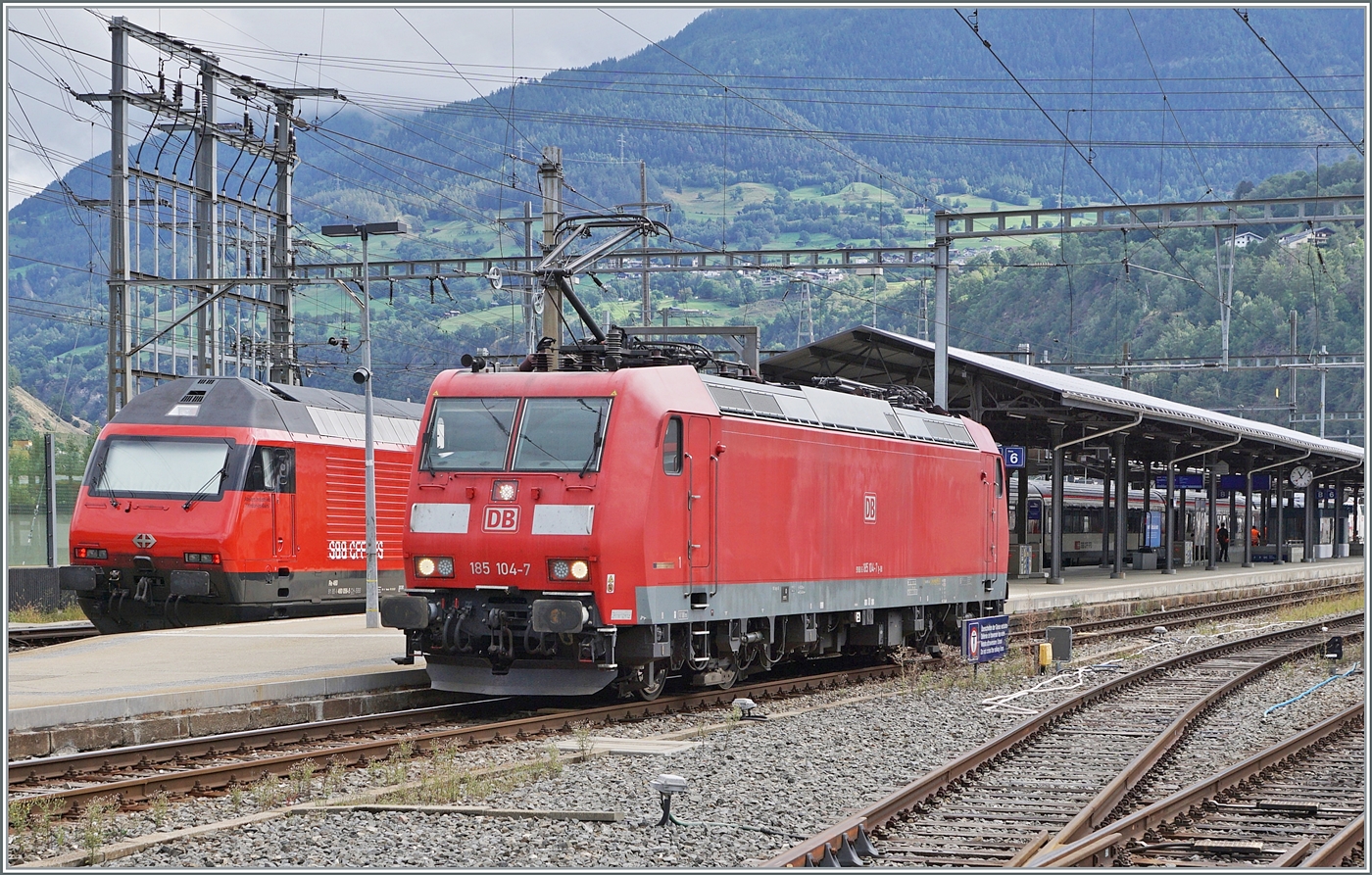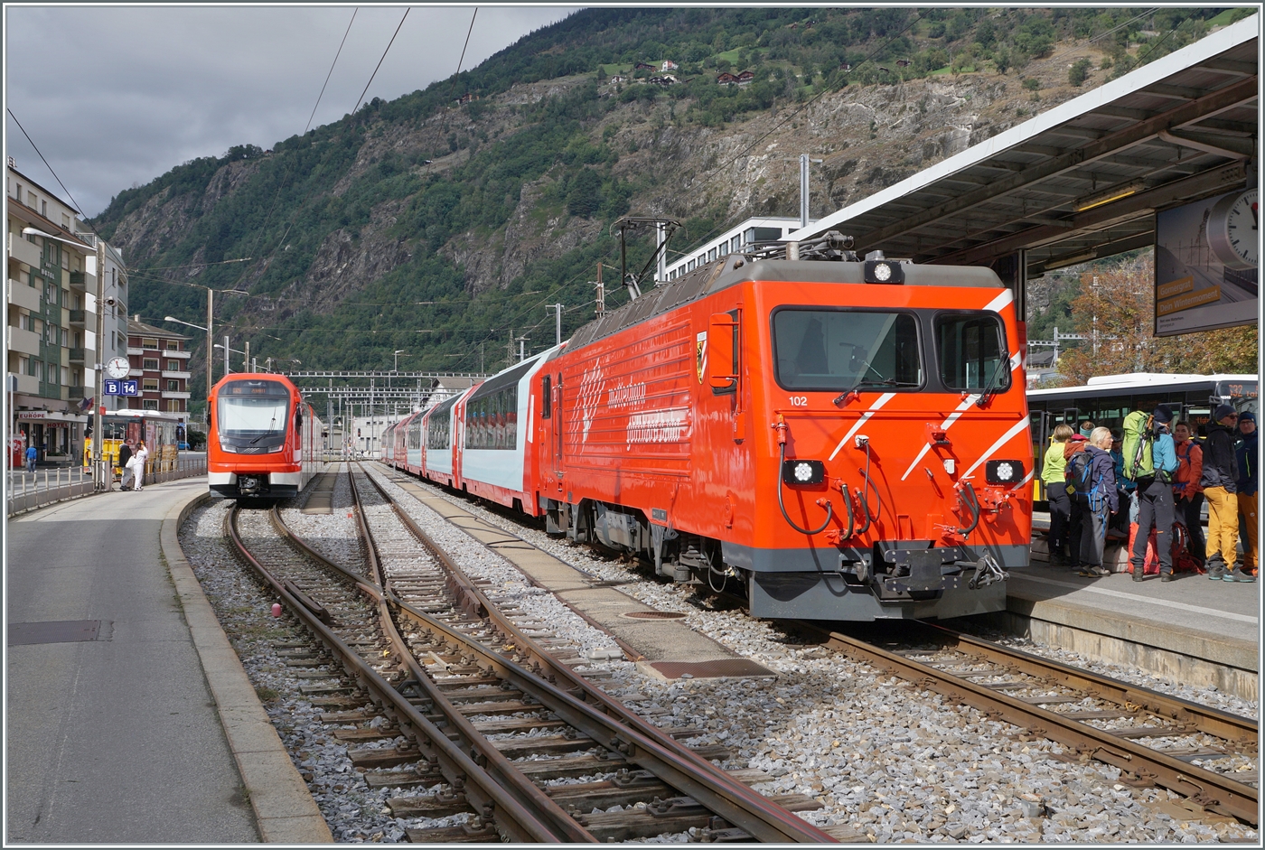 Der Gepäcktriebwagen Deh 4/4 II - 96 "Münster " der Matterhorn-Gotthard-Bahn (MGB), ex FO 96 "Münster " (Furka-Oberalp-Bahn), am 25.05.2023 mit einen Regionalzug von Andermatt nach Visp im Bahnhof (Vorplatz) Brig.