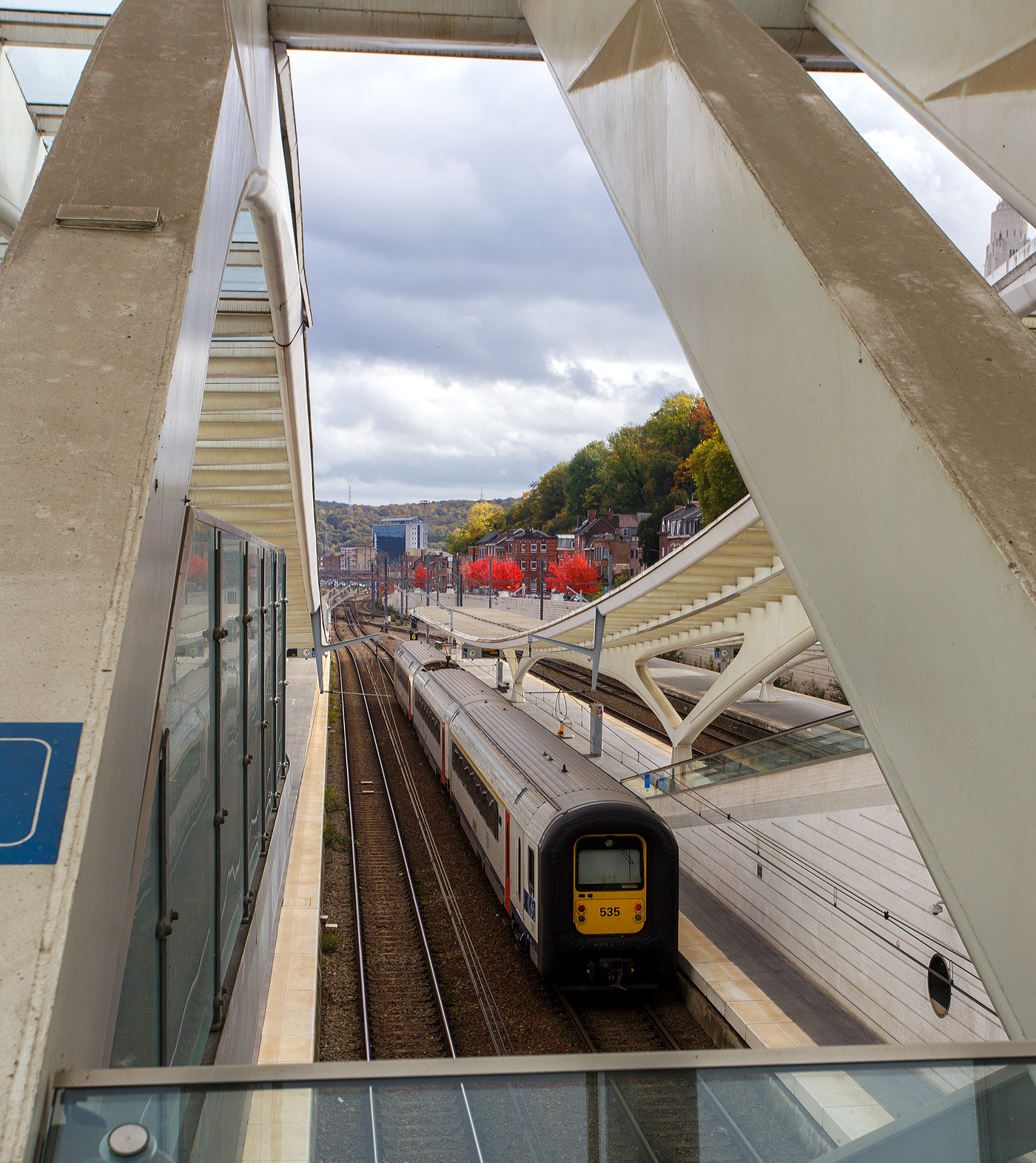 Die Gumminase SNCB/NMBS Triebzug AM 96 - 535 (AM = Automotrice), ein 3 kV Einsystemtriebzug mit GTO-Traktionsstromrichter verlässt am 21 Oktober 2025 den Bahnhof Liège Guillemins (Lüttich-Guillemins). Er fährt als S-Zug Lüttich (Train S Liège) der Linie S 42, die Verbindung (Liers – Herstal – Liège-Saint-Lambert – Liège-Guillemins –Seraing – Flémalle-Haute).