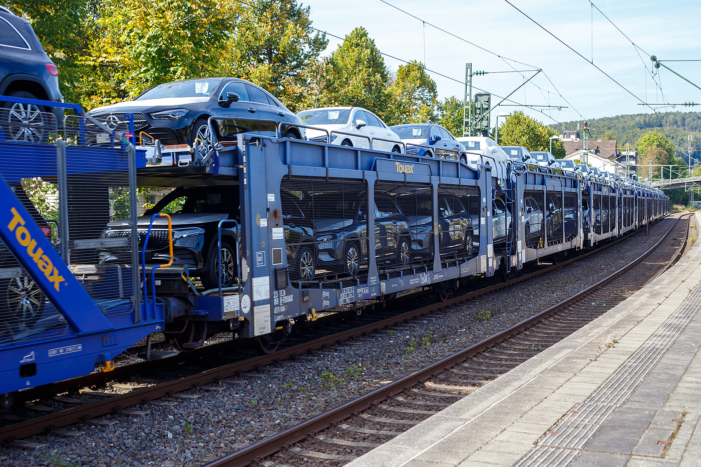 Vierachsige (2 x 2 achsiger) offener Doppelstock-Autotransportwagen (Wageneinheit) beladen PKW der Marke Mercedes-Benz, 23 88 4371 040-7 B-TOUAX, der Gattung Laaers, der irländischen Vermietungsfirma TOUAX Rail Limited (eingestellt in Belgien), am 22 September 2024 eingereiht im Zugverband bei einer Zugdurchfahrt im Bahnhof Kirchen (Sieg).