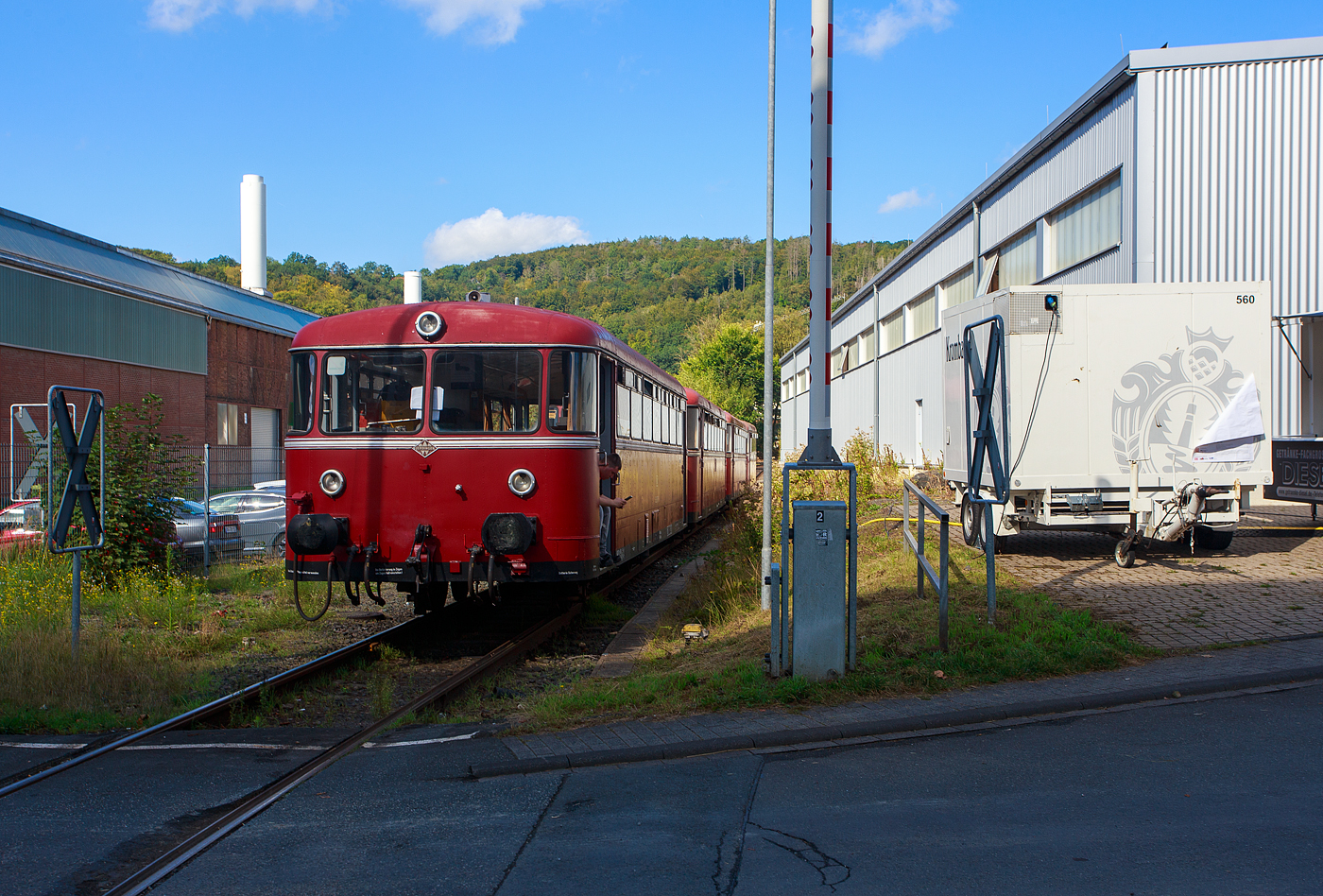 • Ehemaligen Betzdorfer Schienenbus Steuerwagen VS 996 677-1 (95 80 0 996 677-0 D-OEF), ex DB 998 677-9, ex DB VS 98 077. Gebaut 1959 von der Waggonfabrik Uerdingen AG in Krefeld-Uerdingen unter der Fabriknummer 66518.