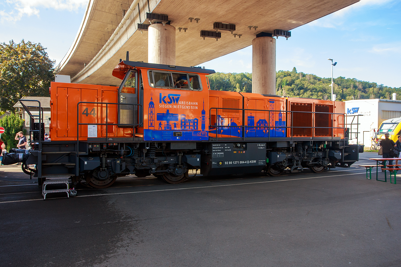 Hier wurde auch die KSW 44 (92 80 1271 004-4 D-KSW) eine MaK G 1000 BB der KSW (Kreisbahn Siegen-Wittgenstein) wurde im neuen Outfit mit Werbung für den Kreis Siegen-Wittgenstein präsentiert, welches die Sehenswürdigkeiten und Wahrzeichen des Kreises zeigen.