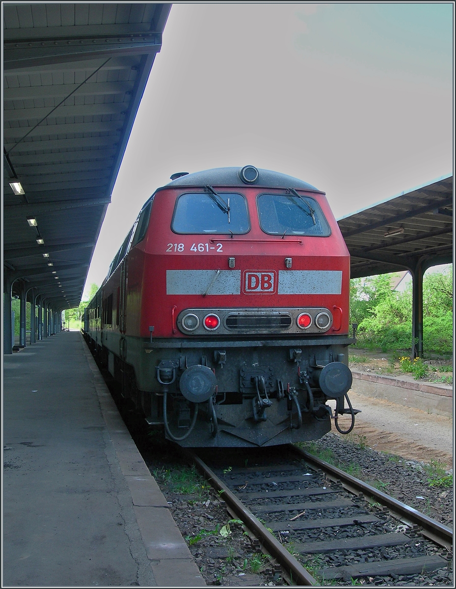 Die DB 218 438-4 mit ihrem IRE von Stuttgart nach Lindau beim Halt in Meckenbeuren.