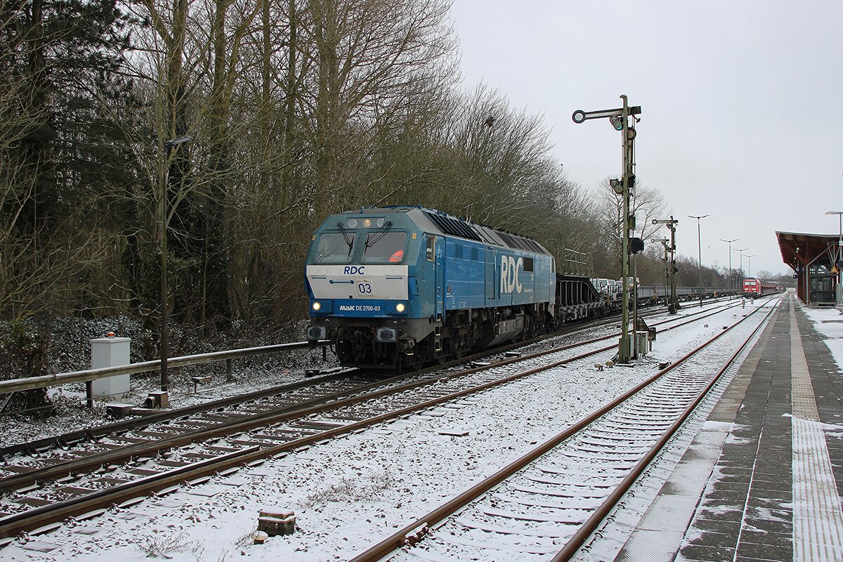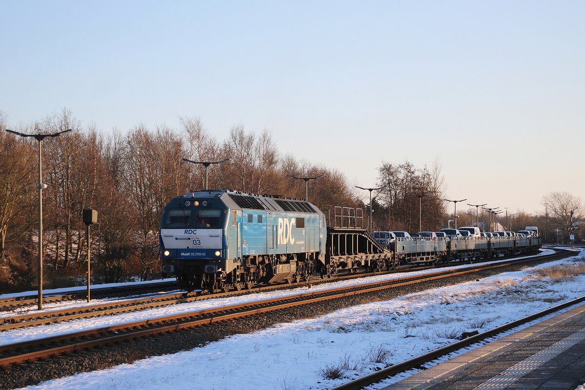 RDC DE 2700-07 schiebt, schmüztig und stark, ein RDC Autozug aus Niebüll nach Westerland (Sylt) am 16 Februar 2026. Schiebediensten an Syltshuttles und RDC Autozüge sind jedoch etwas rares... Leon Schrijvers