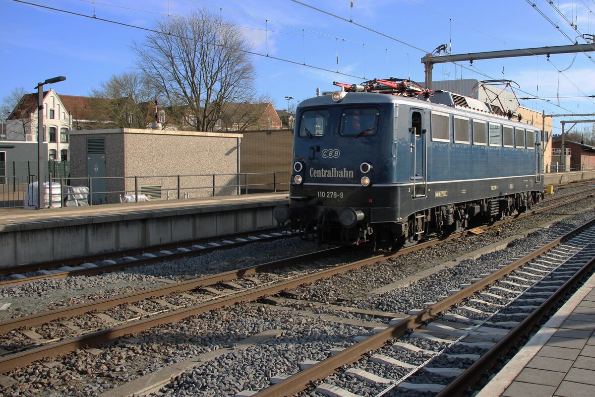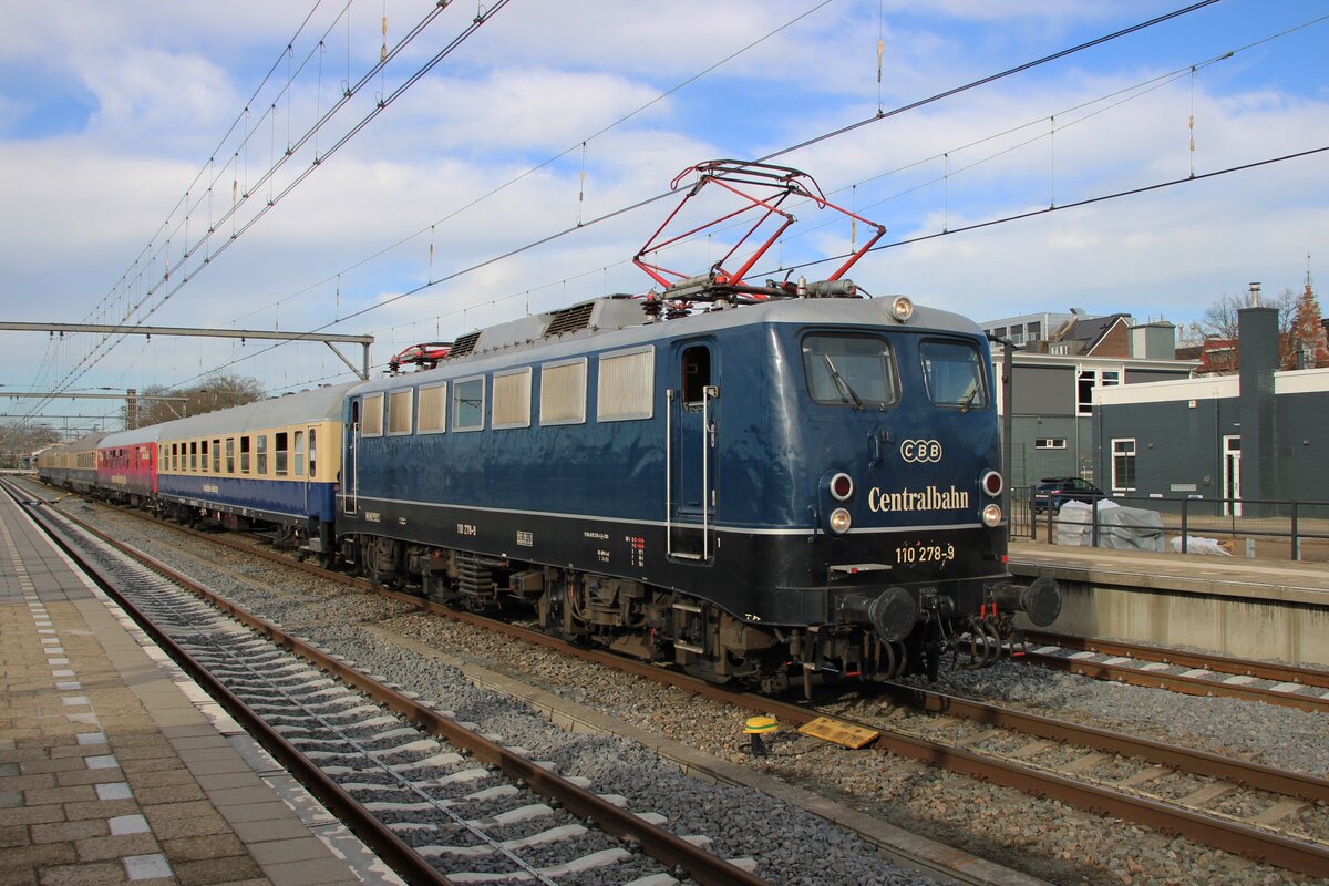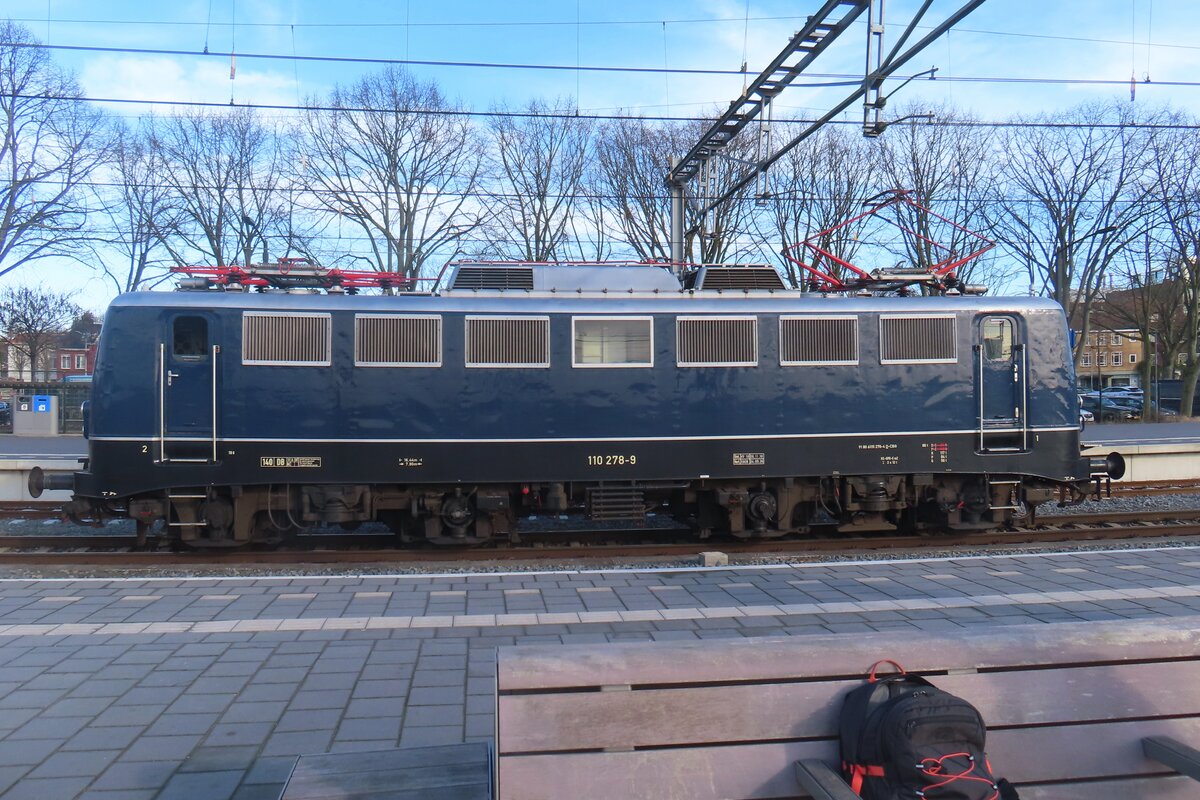 Am & Februar 2026 steht CBB 110 278 mit ein Sonderzug aus Rotterdam in Venlo abfahrtbereit nach Koblenz. Weil es ein Partyzug ist und weil die Bahnsteige am Gleisen 1 und 3 belegt sind, wird der Lokwechsel dieses Sonderzüges auf freiliegendes Gleis 2 gemacht.