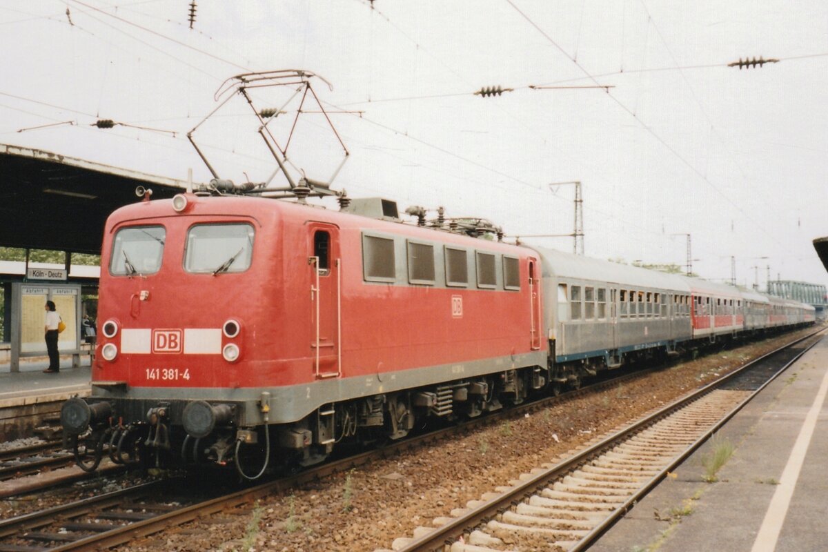 Füssballsonderzug mit 141 371 durchfahrt am 13 April 2000 Köln-Deutz.