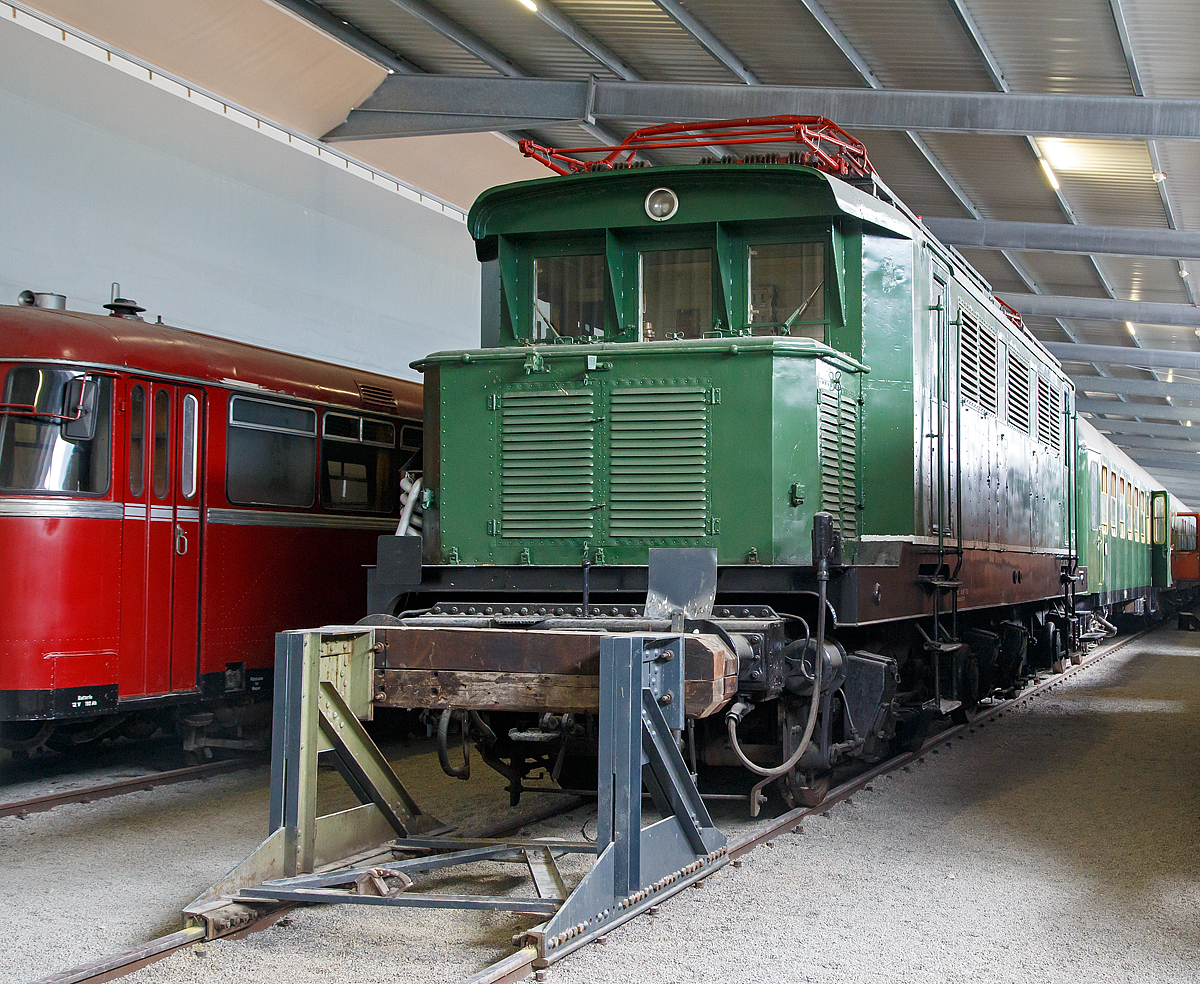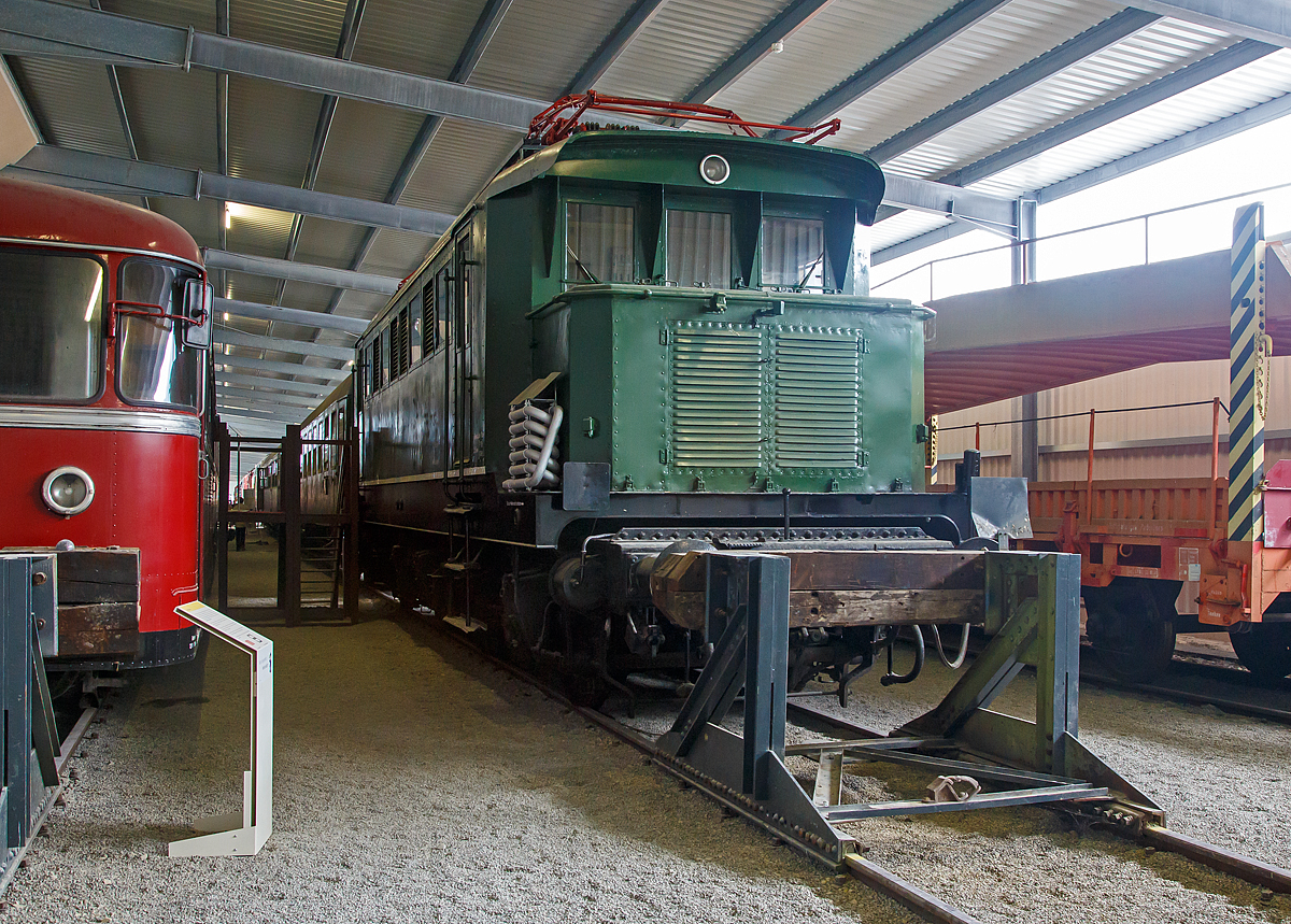 Die DB 144 084-1, ex DB E 44 084, ex DRB E 44 084, ausgestellt am 09.09.2017 in der SVG Eisenbahn-Erlebniswelt Horb (Eigentum DB Museum Nürnberg, Leihgabe an die Eisenbahnerlebniswelt Horb). Die E44 wurde 1938 von der Krauss-Maffei AG in München-Allach unter der Fabriknummer 15650 (mechanischer Teil) gebaut, der elektrische Teil von SSW - Siemens-Schuckert-Werke GmbH in Berlin unter Fabriknummer 3417 und als E44 084 an die Deutsche Reichsbahn (DRB) geliefert. Die Ausmusterung bei der Deutsche Bundesbahn erfolgte 1984 im BW Würzburg, wo sie bis 1996 als Ersatzteilspender für die E 44 119 stand. Am 2.April 1996 wurde die Lok nach Lichtenfels überführt. Am 7.August 2002 wurde die Lok zusammen mit der E 44 059 als Leihgabe an die Pfalzbahn-Eisenbahnbetriebsgesellschaft in das ehemalige Bw Worms überführt. Schließlich wurde die Lok im Jahr 2011 nach Horb gebracht. Die Elektrolokomotiven der Baureihe E 44 waren die ersten Elektrolokomotiven in großer Stückzahl auf dem deutschen Schienennetz. Die E 44 stellt einen Meilenstein der Elektrolokomotiventwicklung dar, denn bei ihr wurde erstmals bei einer größeren Streckenlokomotive auf Vorlaufachsen und Stangenantrieb verzichtet, außerdem wurde der viele Jahre erfolgreiche Tatzlager-Antrieb etabliert. Die als Universallokomotiven konzipierten Lokomotiven erwiesen sich als sehr robust und zuverlässig und prägten den Eisenbahnverkehr in den elektrifizierten Netzen Süd- und Mitteldeutschlands von den 1930er Jahren bis in die 1980er Jahre. Die Elektrolokomotiven der Baureihe E 44 (ab 1968 bei der DB Baureihe 144 bzw. ab bei der DR 1970 Baureihe 244) wurden ab 1930 von Walter Reichel entworfen. Mit ihrem Konzept als Mehrzweck-Elektrolok, die vor Güter- und Personenzüge gespannt werden konnte, kann dies als Pionierleistung betrachtet werden. Die ersten Maschinen wurden ab 1932 von der Deutschen Reichsbahn-Gesellschaft (DRG) in Dienst gestellt, nachdem ein Jahr zuvor eine Vorserienlok (E 44 001) von Krauss-Maffei und den Siemens-Schuckertwerken (SSW, elektrischer Teil) entwickelt und durch die DR erprobt wurde. Die Fahrzeuge mit der Achsfolge Bo’Bo’ waren die ersten deutschen Serienelektroloks mit Drehgestellen ohne Laufachsen und Einzelachsantrieb und vorrangig für die ab 1933 neu elektrifizierte Strecke von Augsburg über die Geislinger Steige nach Stuttgart vorgesehen. Die Lokomotiven bewährten sich dort, so dass weitere Loks an alle wichtigen bayerischen, mitteldeutschen und schlesischen Bahnbetriebswerke, in denen Elektrolokomotiven stationiert waren, geliefert wurden. Bis 1945 wurden die Lokomotiven wegen der militärstrategischen Bedeutung, immer mehr unter Verwendung von Heimbaustoffen, unter der Bezeichnung KEL 1 (Kriegsellok 1) beschafft. Insgesamt wurden 174 Maschinen gebaut, von denen jedoch etliche durch Kriegshandlungen einen Totalschaden erlitten und deshalb ausgemustert werden mussten. Die Mehrzahl der Lokomotiven kam zur Deutschen Bundesbahn. Diese baute sogar sieben Loks nach, da es im Rahmen des Besatzungsstatuts untersagt war, völlig neue Lokomotiven zu entwickeln: 1950 die E 44 181, 1951 die E 44 182 und 183 sowie 1955 die E 44 184 bis 187. Insgesamt verfügte die DB über 125 Lokomotiven. Die DB rüstete mehrere Maschinen für den Wendezugbetrieb aus, kenntlich gemacht durch ein G hinter der Loknummer. Die E 44 mit elektrischer Bremse wurden durch ein W kenntlich gemacht. Diese Lokomotiven wurden u. a. auf der Höllentalbahn im Schwarzwald eingesetzt. Ab 1968 wurde bei der DB die E 44 als Baureihe 144 umgezeichnet. Die Lokomotiven mit elektrischer Bremse wurden in Baureihe 145 (Deutsche Bundesbahn) umgezeichnet. TECHNISCHE DATEN: Spurweite: 1.435 mm Achsanordnung: Bo'Bo' Länge über Puffer: 15.290 m Drehzapfenabstand: 6.300 mm Achsabstand im Drehgestell: 3.500 mm Treibraddurchmesser: 1.250 mm Höchstgeschwindigkeit: 90 km/h Stundenleistung: 2.200 kW bei 76 km/h Dauerleistung: 1.860 kW bei 86 km/h Anfahrzugkraft: 196 kN Stundenzugkraft: 104 kN Dauerzugkraft: 78 kN Dienstgewicht: 78,0 t Achslast: 19,5 t Stromsysteme: 15 kV 16 2/3 Hz, Oberleitung Antrieb: Tatzlagerantrieb Anzahl der Fahrstufen: 15 Transformator: OFA