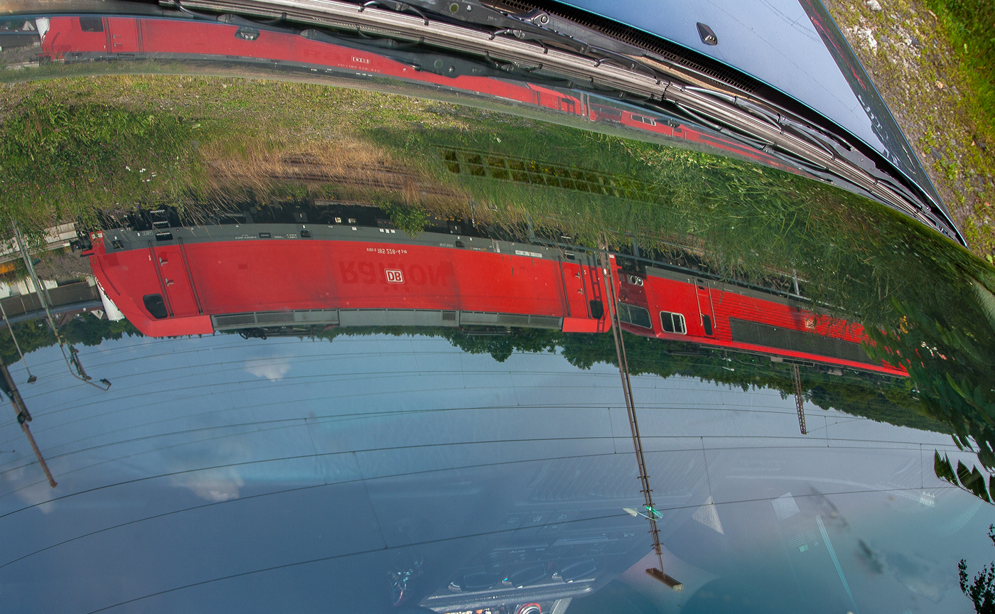 Ein etwas anderes Bahnbild, die DB 185 228-4 und die DB 155 243-9 spiegeln sich am 14 Juli 2013 in der Windschutzscheibe von meinem Auto.