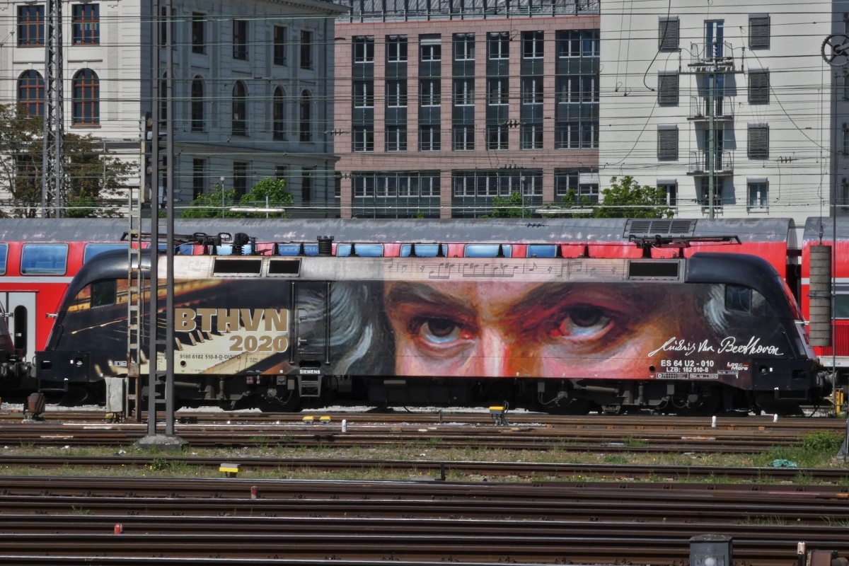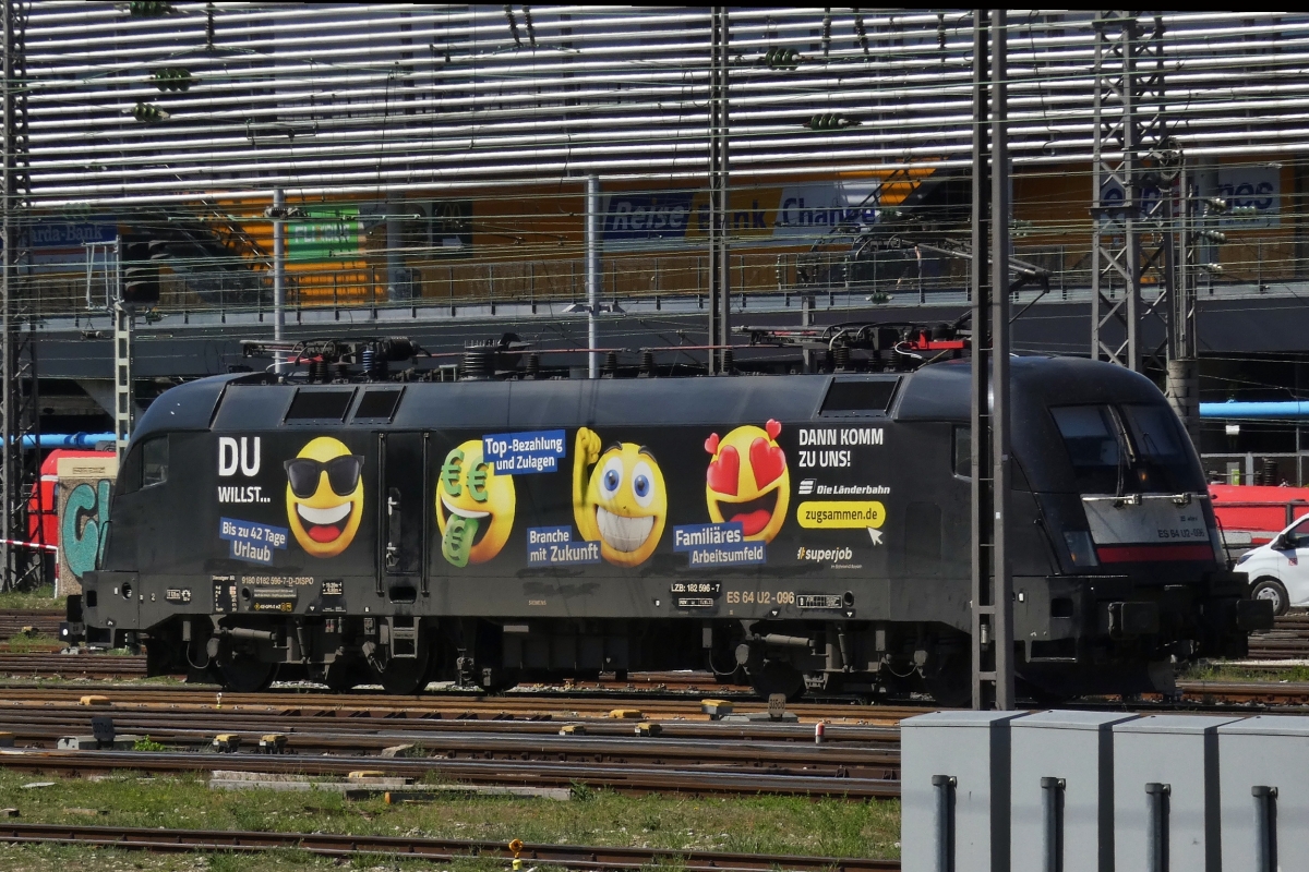 Werbelok 182 506-7, (ES 64 U2-96), wurde im Gleisvorfeld des Hbf. von München abgestellt. 01.05.2025