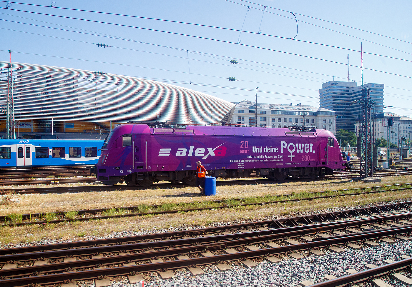 Die "Alex" 183 005-8 (91 80 6183 005-8 D-DLB) ist am 25 Juli 2022 beim Hbf München abgestellt.