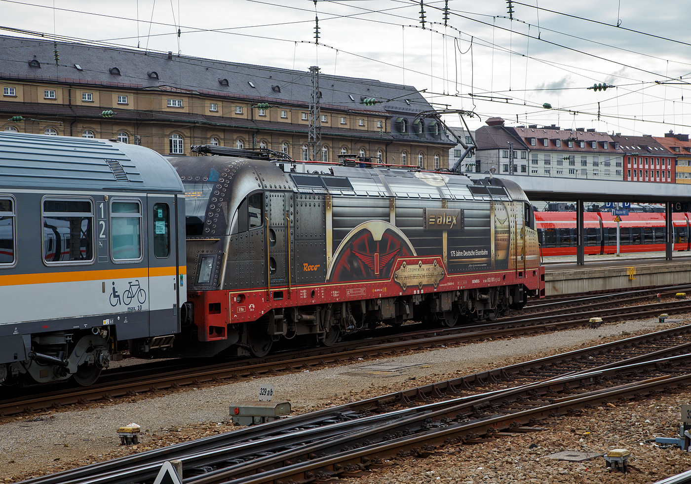Die wunderschöne ALEX Lok 183 001-7 (91 80 6183 001-7 D-DLB) "175 Jahre Deutsche Eisenbahn" schiebt am 06 Juni 2019 einen ALEX-Zug aus den Hbf München in die Abstellgruppe. Das Design ist von der Österreicherin Gudrun Geiblinger und angelehnt an die Lokomotive "Adler"