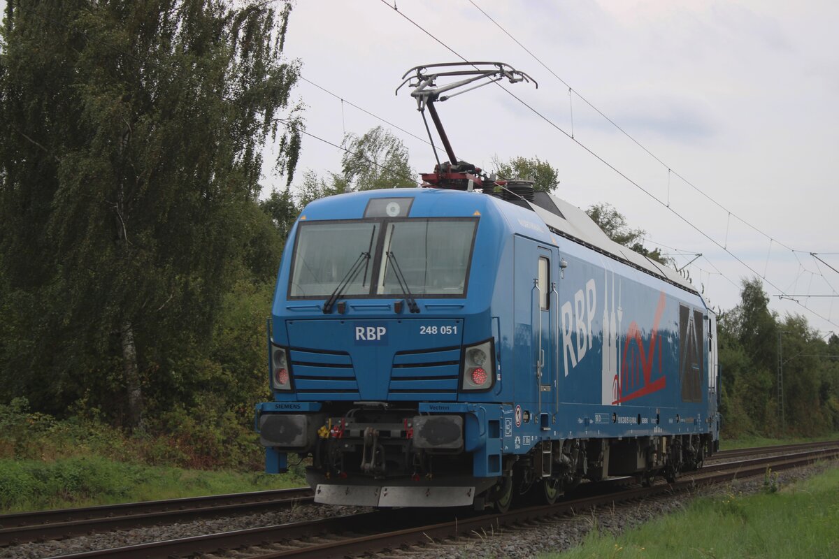 Die an die ERC.D GmbH (European Railway Company Deutschland, Nürnberg) vermietete SIEMENS Vectron Dual Mode 248 039-0 (90 80 2248 039-0 D-ATLU) der Alpha Trains Luxembourg s.à.r.l. fährt am 23 August 2025, mit der an die WRS Deutschland GmbH vermietete 151 033-3 (91 80 6151 033-8 D-SRI) der SRI Rail Invest GmbH im Schlepp, durch Scheuerfeld/Sieg in Richtung Köln.