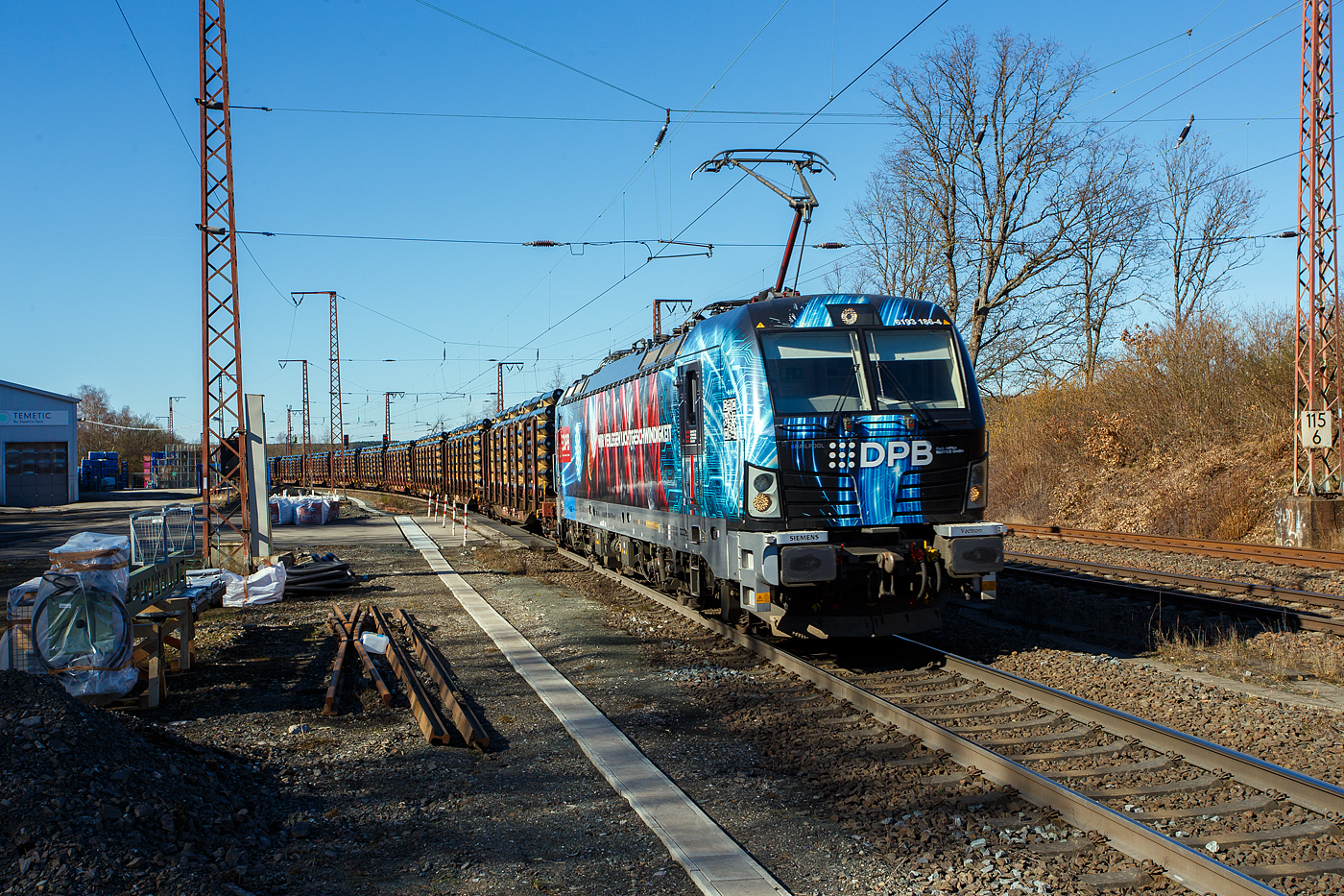Die schöne an die österreichische DPB Rail Infra Service GmbH (Frauental/A) vermietete Siemens Vectron MS – 6193 186 (91 80 6193 186-4 D-Rpool) der Railpool GmbH (München) fährt am 02 März 2026, mit einem Röhrenzug (Drehgestellflachwagen mit Niederbindeeinrichtungen der Gattung Snps 719 / Sns 727 beladen mit beschichteten Stahlrrohren) durch Rudersdorf (Kr. Siegen) in südlicher Richtung. Nochmals einen lieben Gruß an den netten Lokführer zurück. Die Multisystemlokomotive Siemens Vectron MS wurde 2024 von SIEMENS Mobilitiy in München-Allach unter der Fabriknummer 23486 gebaut und im Oktober 2024 an die Railpool ausgeliefert. Hier in der ausgeführten Variante MS A54 ist sie eine „echte“ Multisystemlokomotive und kann in halb Europa fahren. Sie hat die Zulassungen und Länderpakete für Deutschland, Österreich, Belgien, die Niederlande, Tschechien, die Slowakei, Ungarn, Rumänien, Bulgarien, Kroatien und Polen. Für Serbien (SRB) ist auch eine Zulassung vorgesehen, ist z.Z. aber noch durchgestrichen. So besitzt die Variante MS A54 folgende Zugsicherungssysteme: ETCS BaseLine 3, sowie für Deutschland (PZB90 / LZB80 (CIR-ELKE I)), für Österreich (ETCS Level 1 mit Euroloop, ETCS Level 2, PZB90 / LZB80), für Belgien (ETCS L1, ETCS L2, TBL1+), für die Niederlande (ETCS Level 1, ETCS Level 2, ATB-EGvV), für Tschechien und die Slowakei (LS (Mirel)), für Ungarn (ETCS Level 1, EVM (Mirel)), für Polen (SHP) und für Rumänien, Serbien, Bulgarien und Kroatien (PZB90).