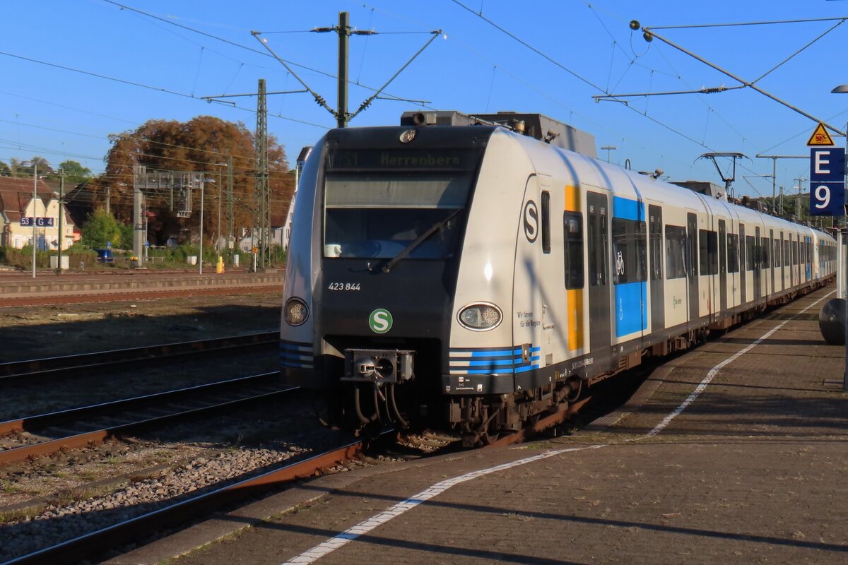 Stuttgarter S-Bahn 423 844 treft am 19 September 2025 in Plochingen ein.