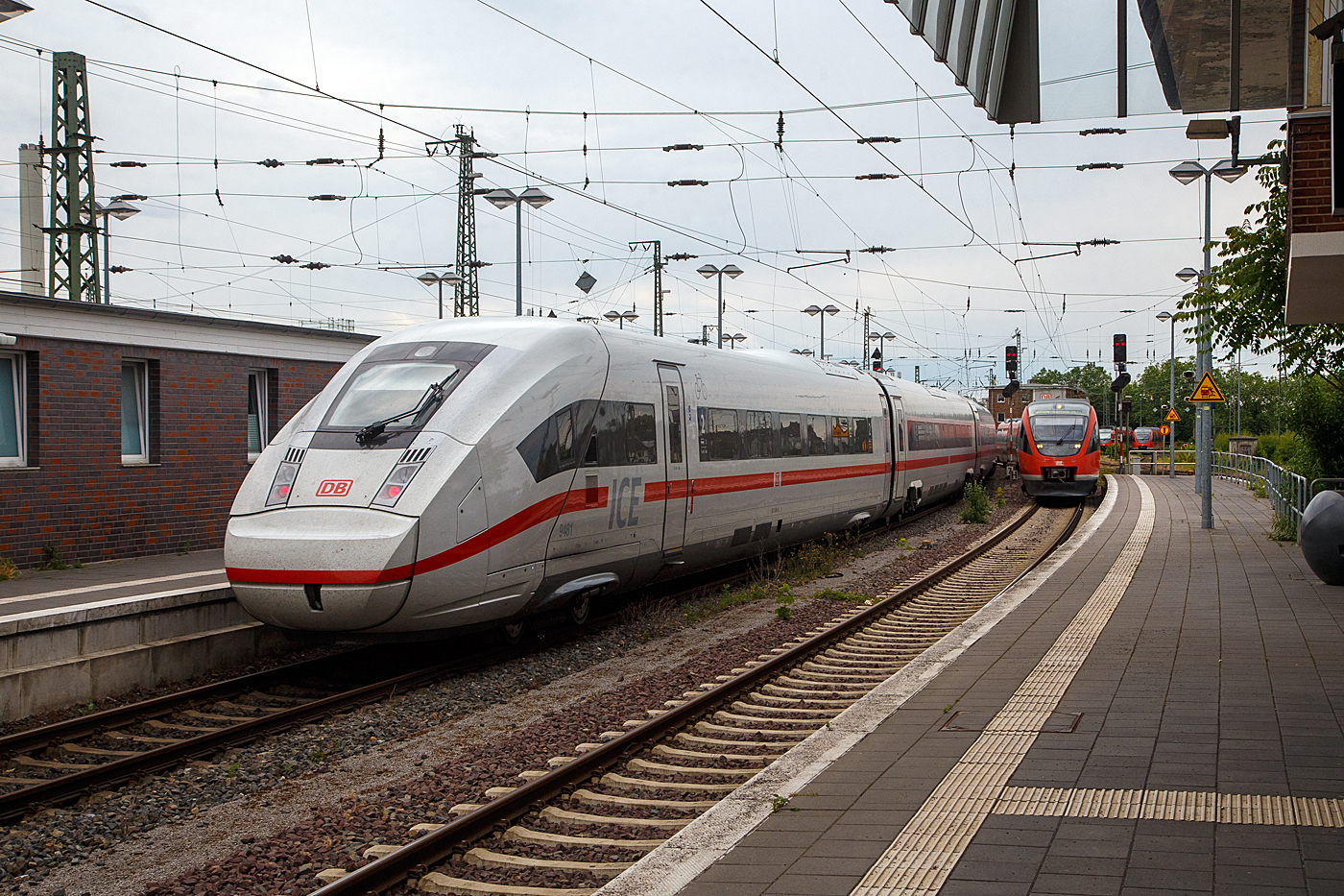 Der ICE 4 der BR 412.4 (dreizehnteilig) – Tz 9481 (seit Juli 2022 mit dem Taufnamen „Rheinland-Pfalz“ unterwegs) verlässt am 31 Mai 2022, als ICE 615 von Hamburg-Altona nach München Hbf (via Hamburg Hbf, Bremen Hbf, Münster Hbf, Dortmund Hbf, Köln Hbf, Frankfurt Flughafen Fernbf., Mannheim und Stuttgart Hbf), den Hauptbahnhof Münster (Westfalen). Der ICE war zum Zeitpunkt der Aufnahme recht frisch, die Inbetriebnahme erfolgte erst am 11. April 2022, seine erste Fahrt im Plandienst war (10 Tage vor der Aufnahme) am 21. Mai 2022 als ICE 277 Berlin–Frankfurt–Basel, er hat auch die Zulassung für die Schweiz. Recht fahren zwei gekuppelte 3-teilige diesel-elektrischen Bombardier Talent der Baureihe 644 der DB Regio NRW, als RB 64 „Euregio-Bahn“ Münster – Gronau – Enschede (NL), ein. Weiter rechts stehen noch weitere Bombardier Talent.