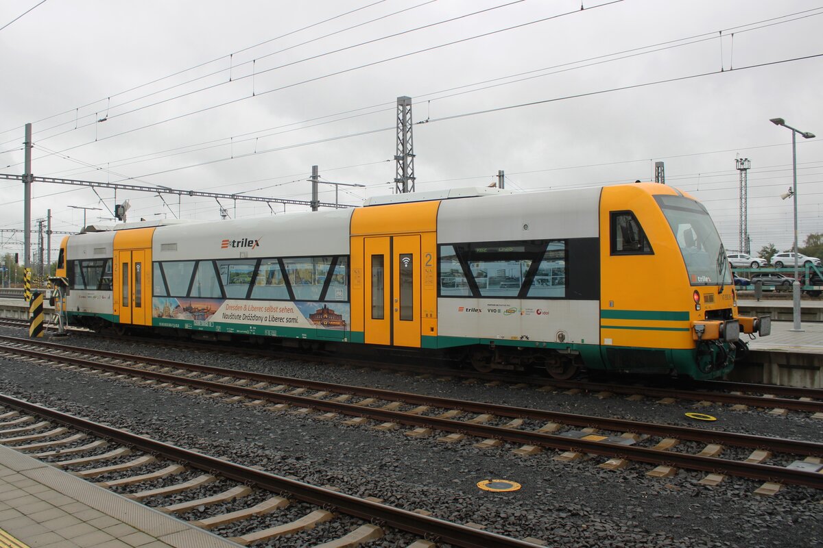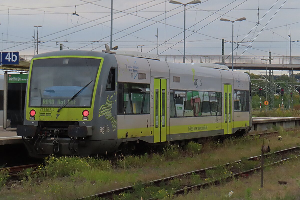 Nun steht der Stadler Regio-Shuttle RS1 – VT 650.74 (95 80 0650 074-7 D-DLB) RS1 der „oberpfalzbahn“ eine Marke der „Die Länderbahn GmbH (DLB)“, am 17.04.2023, als RB 95 (Hof - Cheb), im Hbf Hof zur Abfahrt bereit.