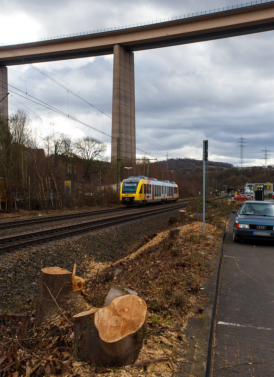 Welch seltener Gast auf der Siegstecke, auch wenn Triebzüge und -wagen der HLB hier Alltag sind, ist die Güterlok der HLB meist in und um Kassel unterwegs. Die Diesellokomotive 275 024-8, alias DG 1131 (92 80 1275 024-8 D-HEB), die Vossloh/MaK G 1206 der HLB - Hessische Landesbahn GmbH, hat am 16 Oktober 2025, auf den Weg in Richtung Köln, im Bahnhof Kirchen/Sieg Hp 0, da es eine Weichenstörung gab.