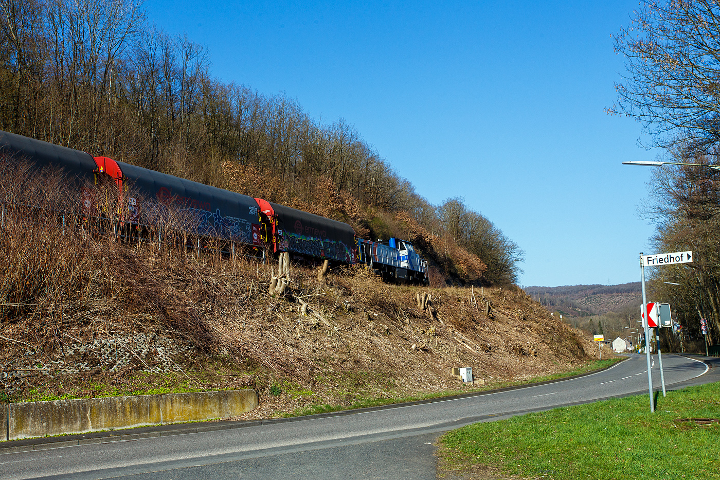 Am Zugschluss die nachschiebende KSW 45 (98 80 0276 016-9 D-KSW) eine MaK G 1204 BB der KSW (Kreisbahn Siegen-Wittgenstein). Sie schieb am 19 März 2025 den schweren Coilzug von Betzdorf/Sieg in Richtung Herdorf zum KSW-Rangierbahnhof (Betriebsstätte FGE - Freien Grunder Eisenbahn) nach, hier bei Herdorf-Sassenroth.
