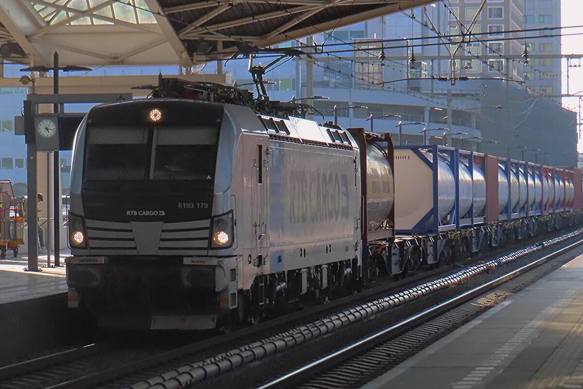 Gegenlicht und SWchatten: am Abend von 18 März 2026 durchfahrt RTB 193 173 mit der Blerick-KLV Tilburg.