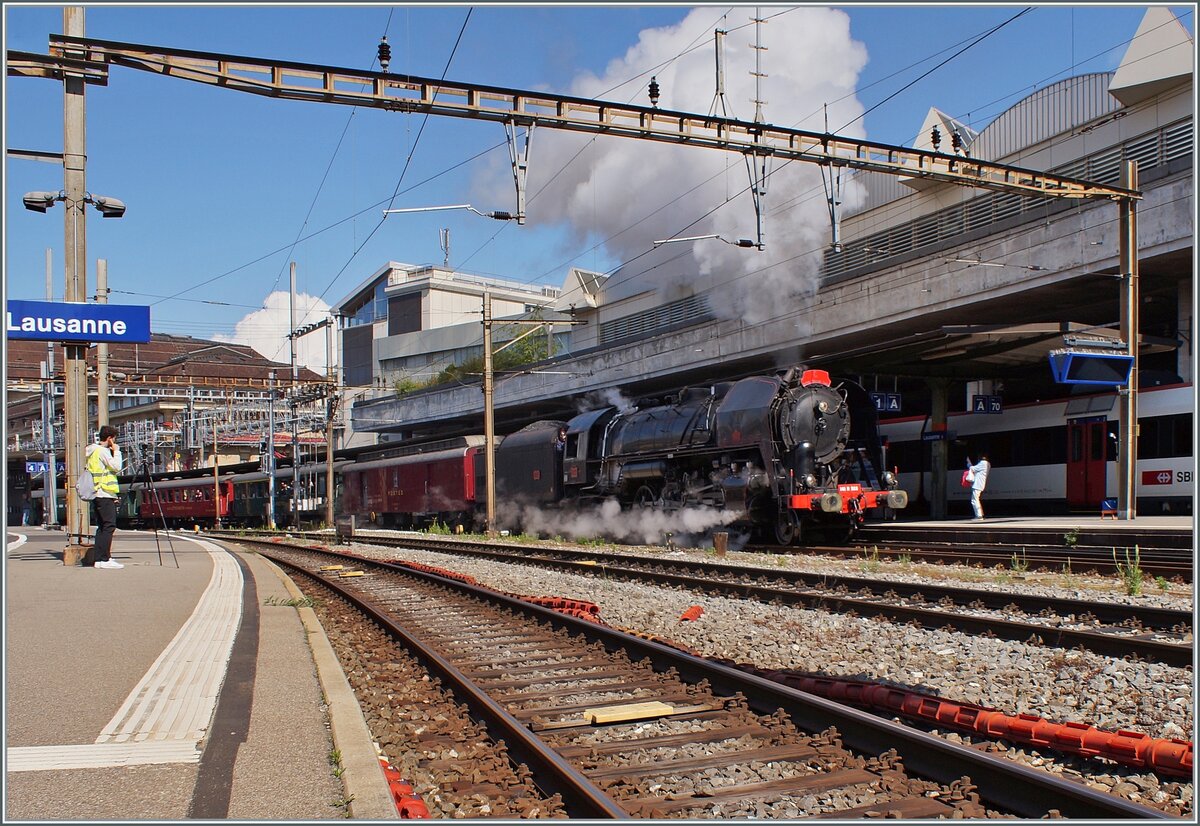 Die SNCF 141 R 1244 hat in Zürich HB mit der Stammkomposition die Kurswagen von Schaffhausen übernommen und wird nun für die baldige Abfahrt nach Luzern vorbereitet.