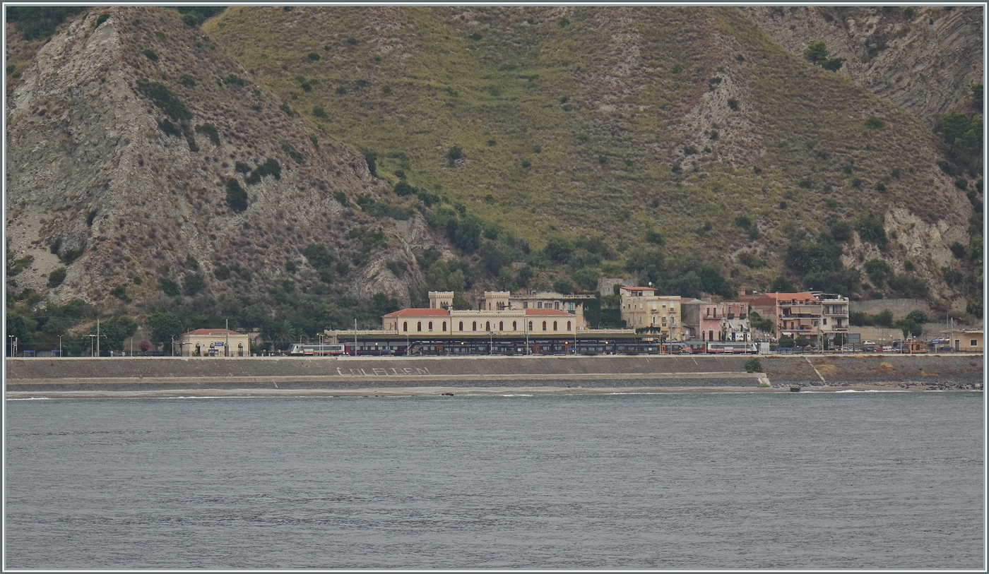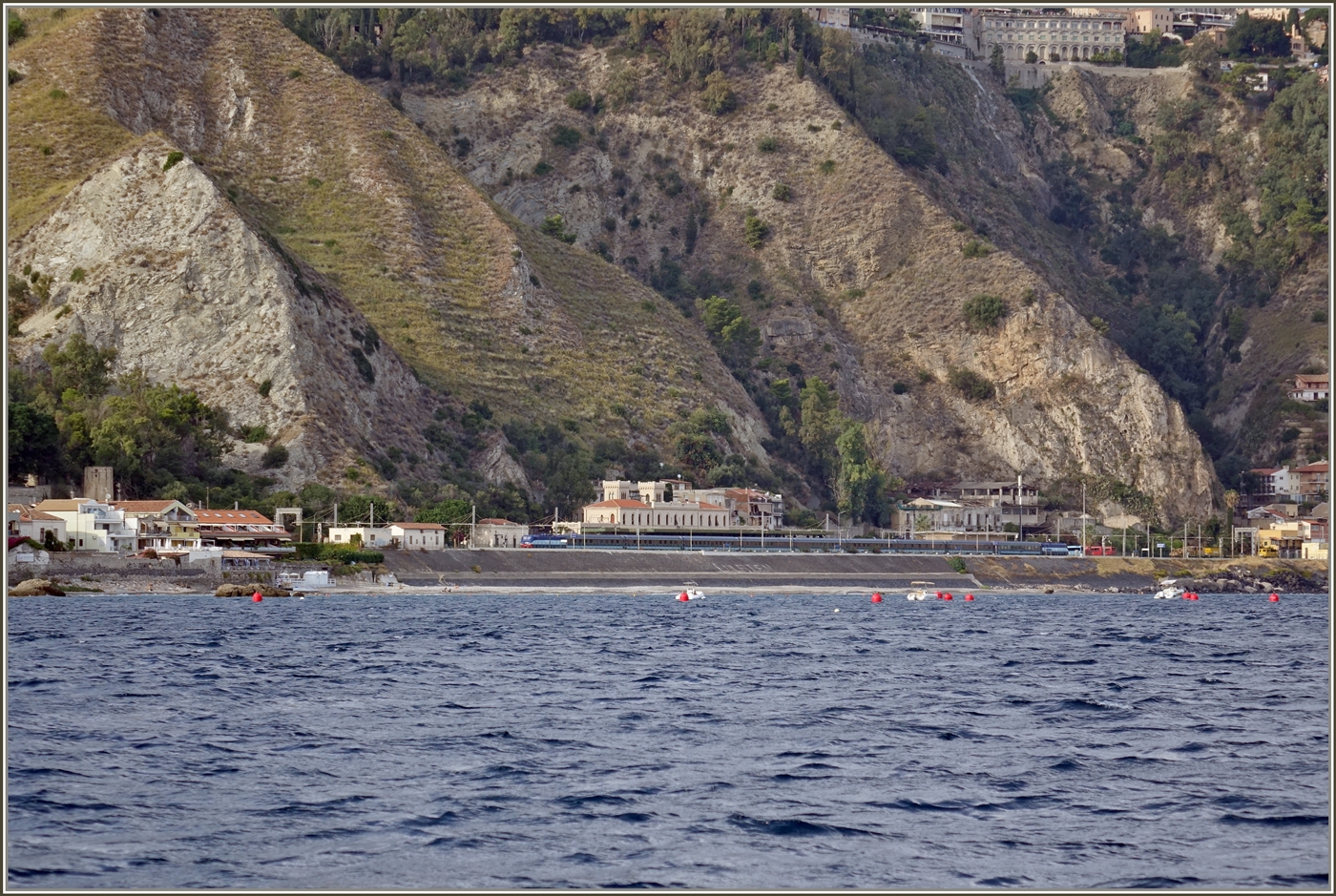 Ein Blick auf den Bahnhof Taormina Gardini vom Meer her: Während der interCity notte 1959 von Roma Termini nach Siracusa im Bahnhof kurz hält,  verdeckt   ein dort abgestellter FS Treniatlia ETR 104 (Coradia Stream Pop) die Sicht auf den Nachtzug.