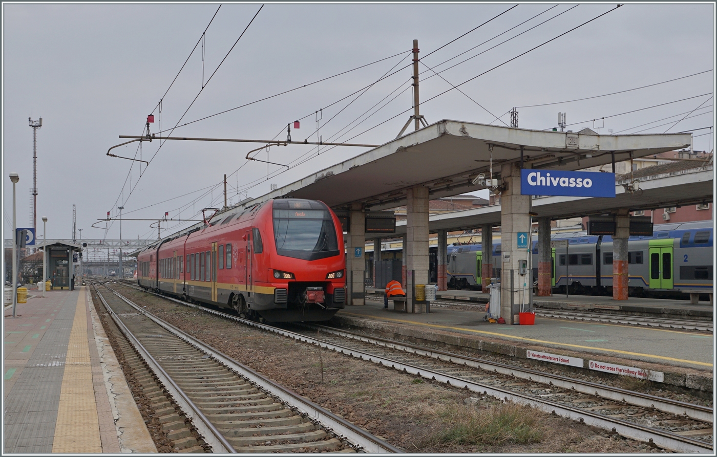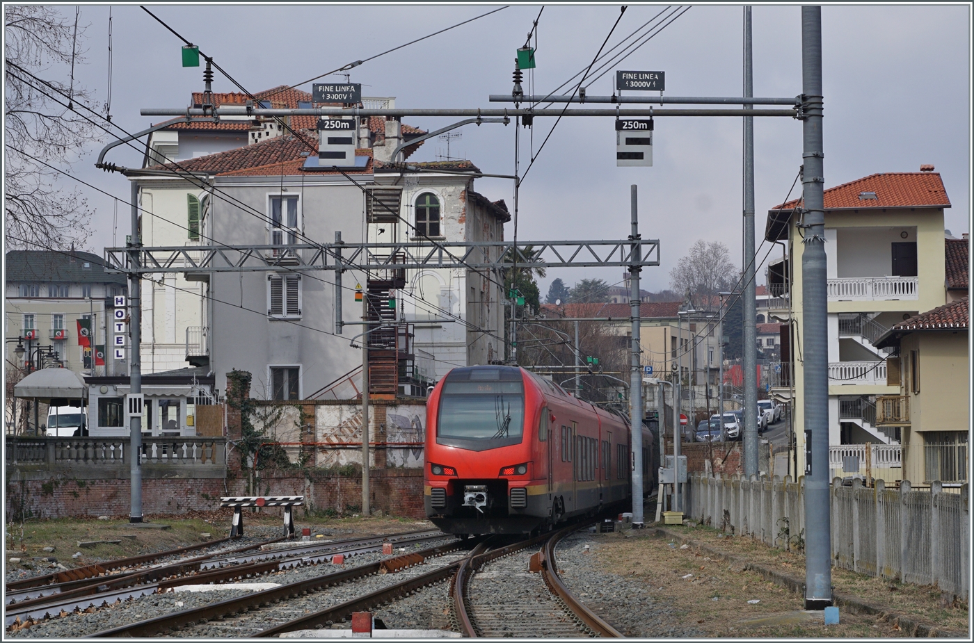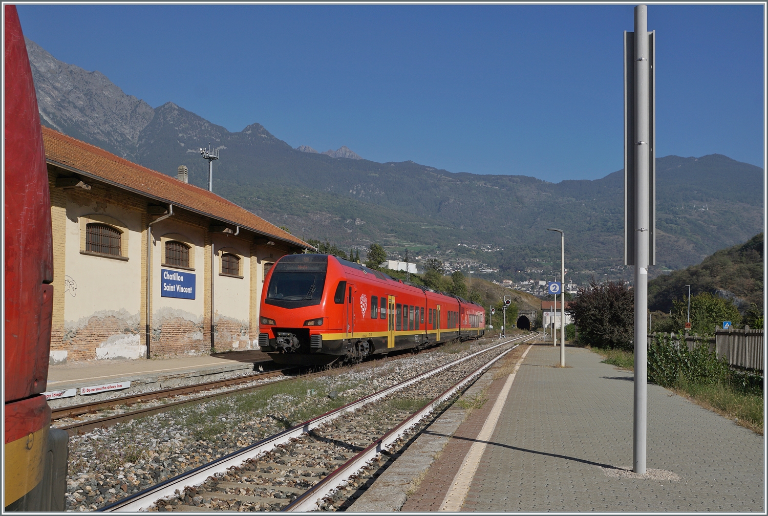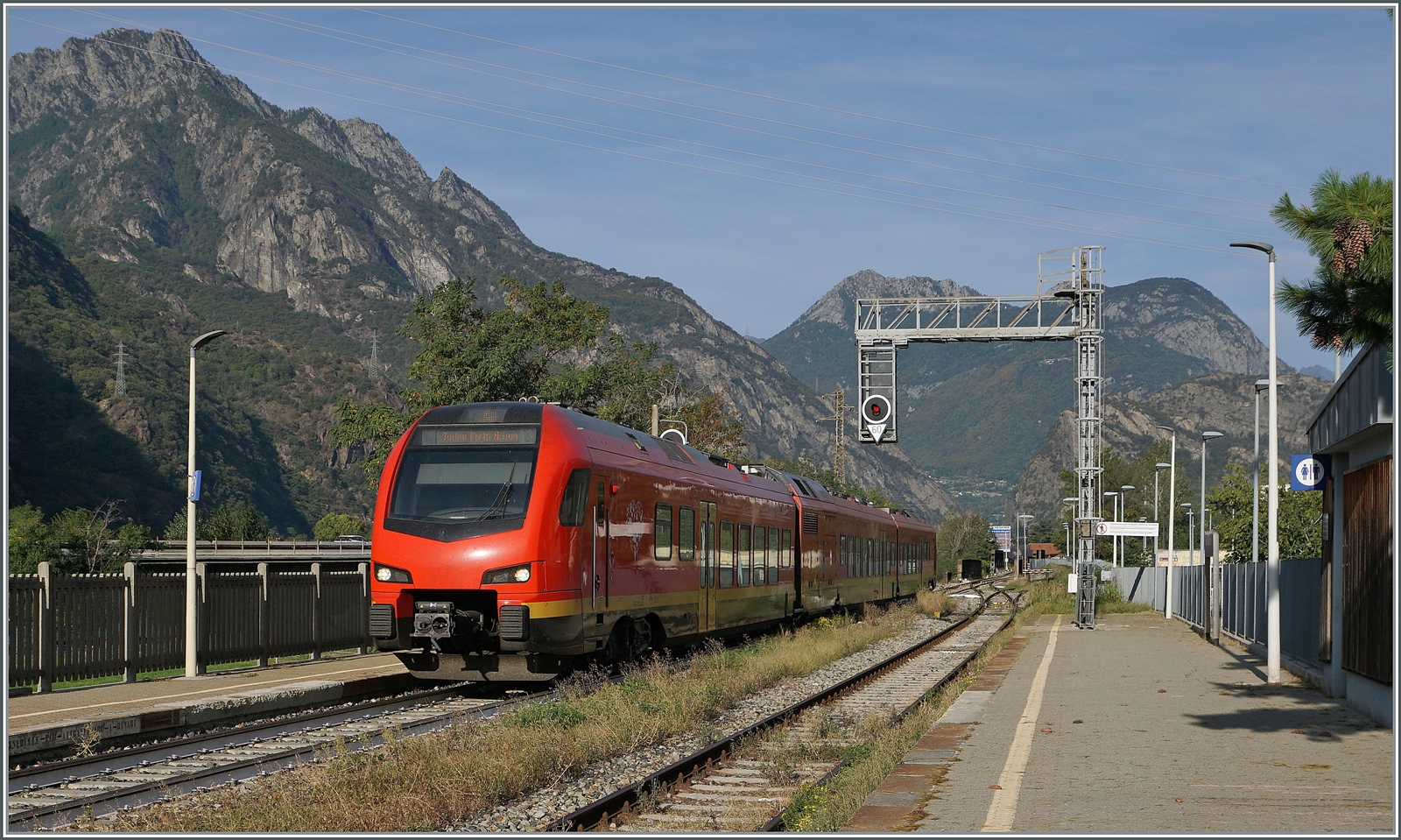 Bei etwas besserem Licht aber als Nachschuss: der FS Treniatlia BTR 813 001 verlässt als RV VdA 2725 von Torino nach Aosta den Bahnhof von Verres.