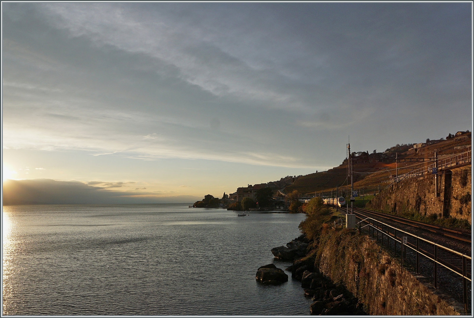 Wieviel Bearbeitung darf es sein? Zwei ähnliche Bilder, das eine aufgehübscht und das andere praktisch unbearbeitet. Während hinter meinem Rücken die Sonne unter geht, ist zwischen St-Saphorin und Rivaz der FS Trenitalia ETR 610 002 als EC 30008 auf dem Weg von Domodossola nach Genève Aéroport. 15. November 2024