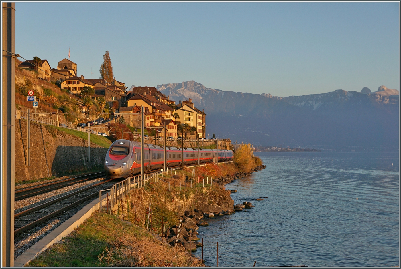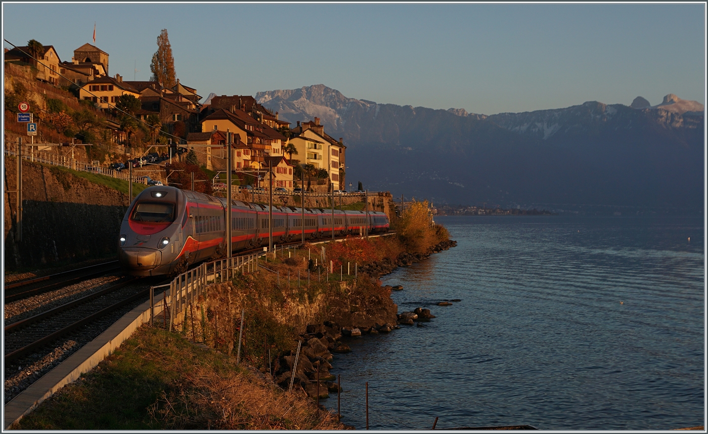 Fragt sich, ob man bei der schöne Abendstimmung noch Lust hat, den Zug zu suchen... Bei Rivaz ist ein FS Trenitalia ETR 610 als EC von Domodossola nach Genève unterwegs. 12. November 2024