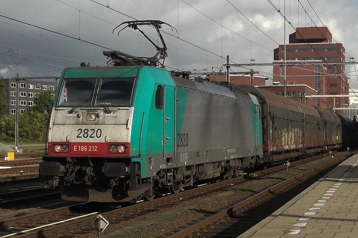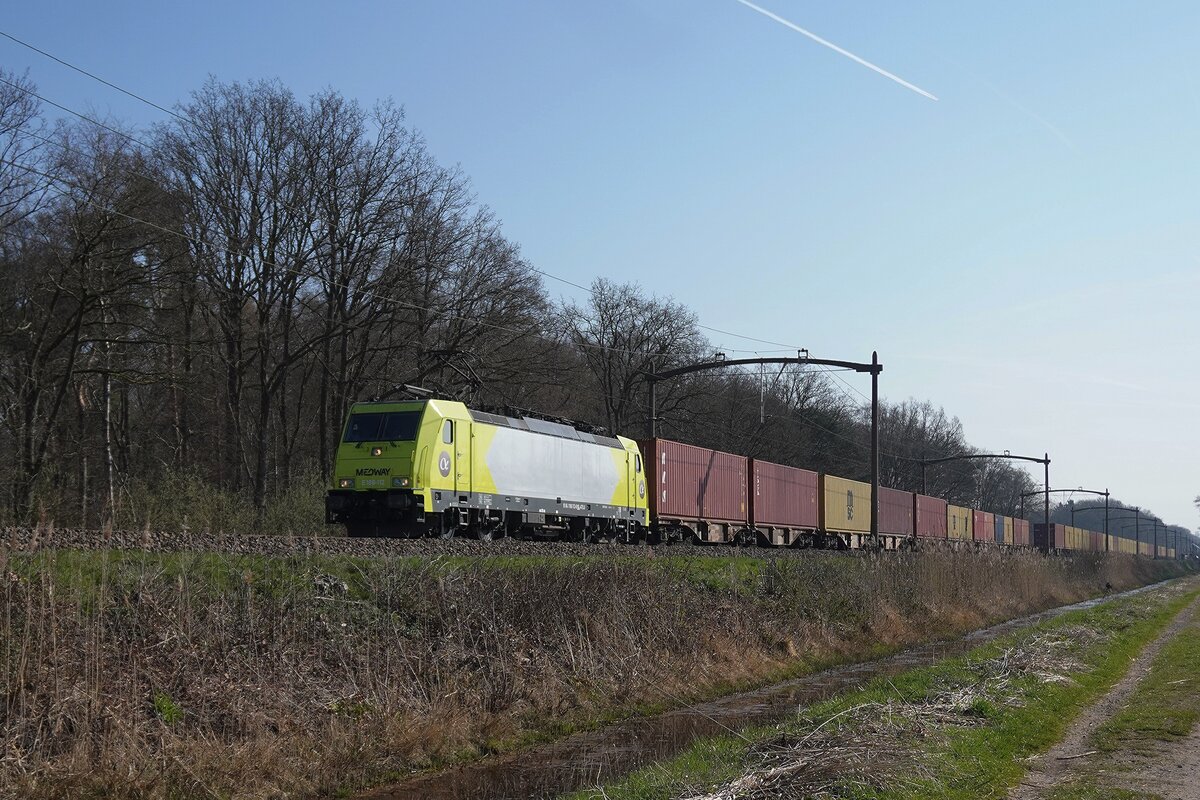 Eine halbe Stunde nach vorherigen Bild passiert rettender Engel Lineas 186 502 mit der bei Tilburg-Universiteit liegen gebliebener Mischer Tilburg-Reeshof, 22 dezember 2021.