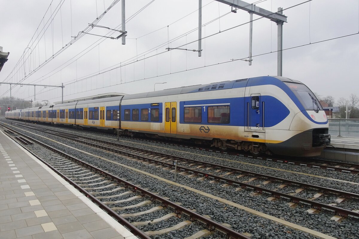Zwei gekuppelte vierteilige NS Sprinter Light Train (Serie 2400) verlassen am 31.03.2018 den Bahnhof Amsterdam Centraal.