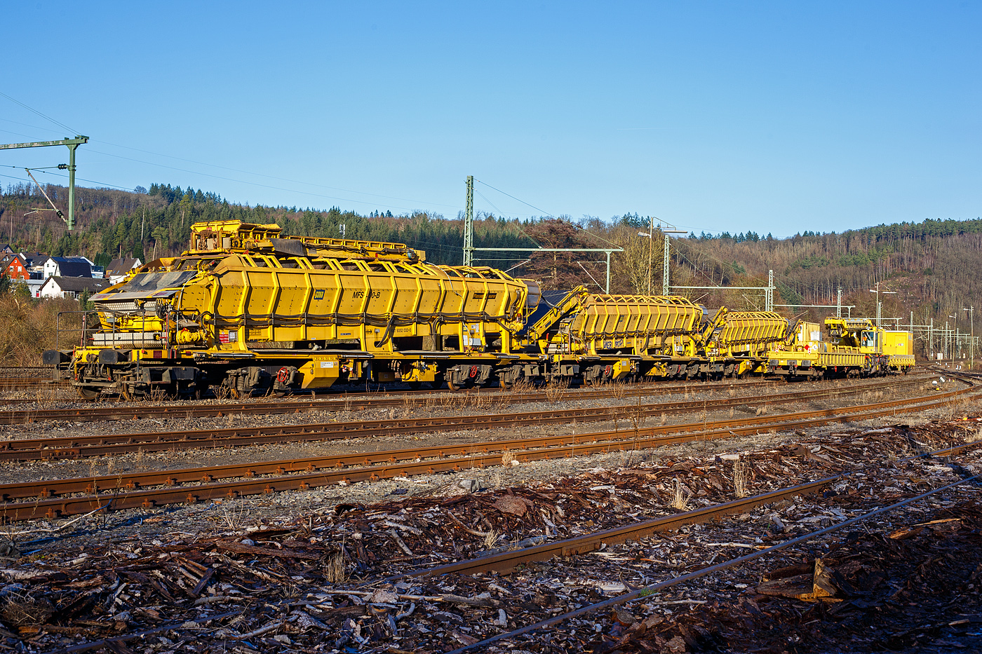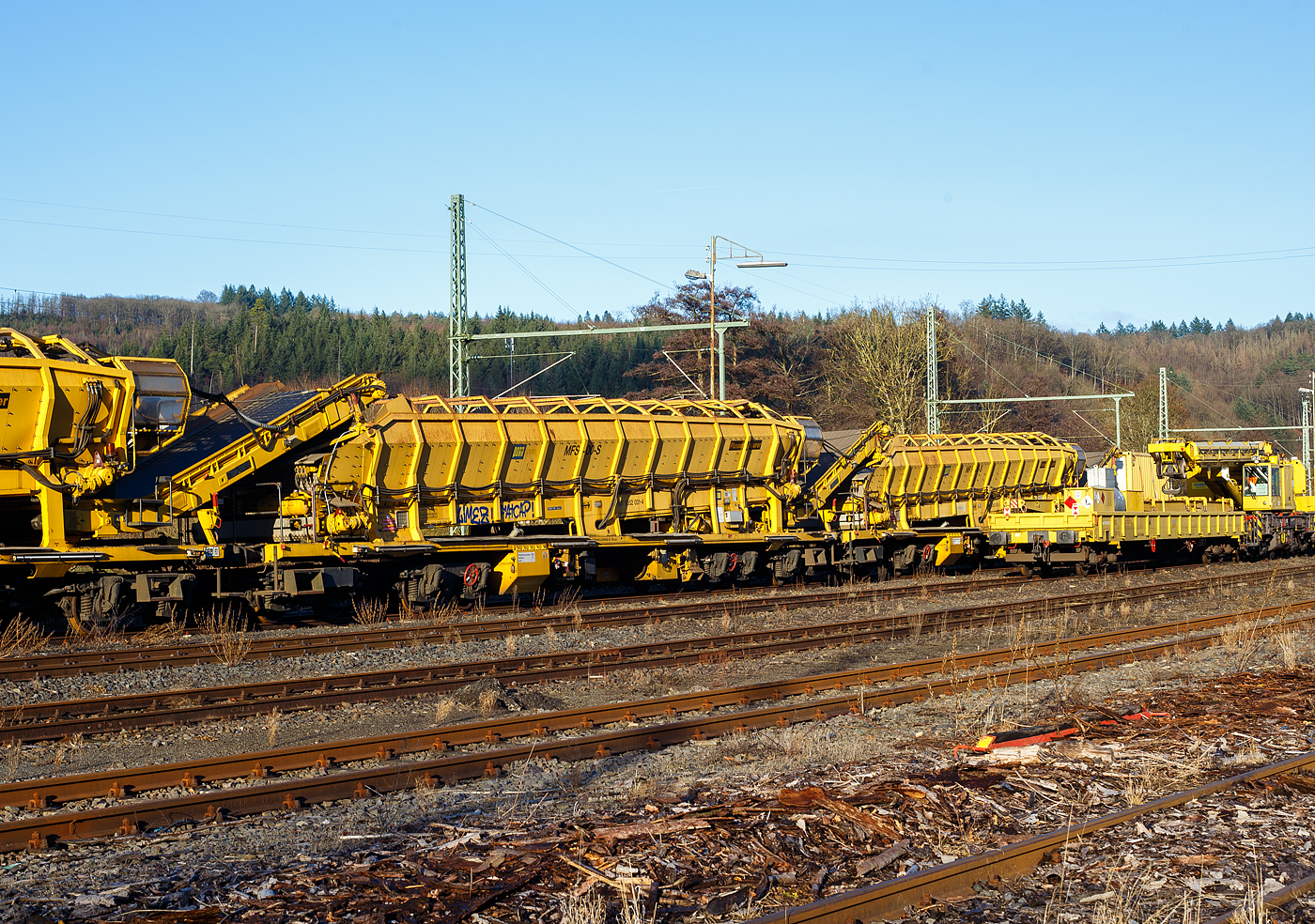 Der Getrennte Schottersammelzug steht unterhalb des Bahnüberganges in Enscherange ,während die restlichen Wagen zu der Entladestelle zum Entleeren in der Nähe Drauffelt gezogen wurden. 25.08.2023