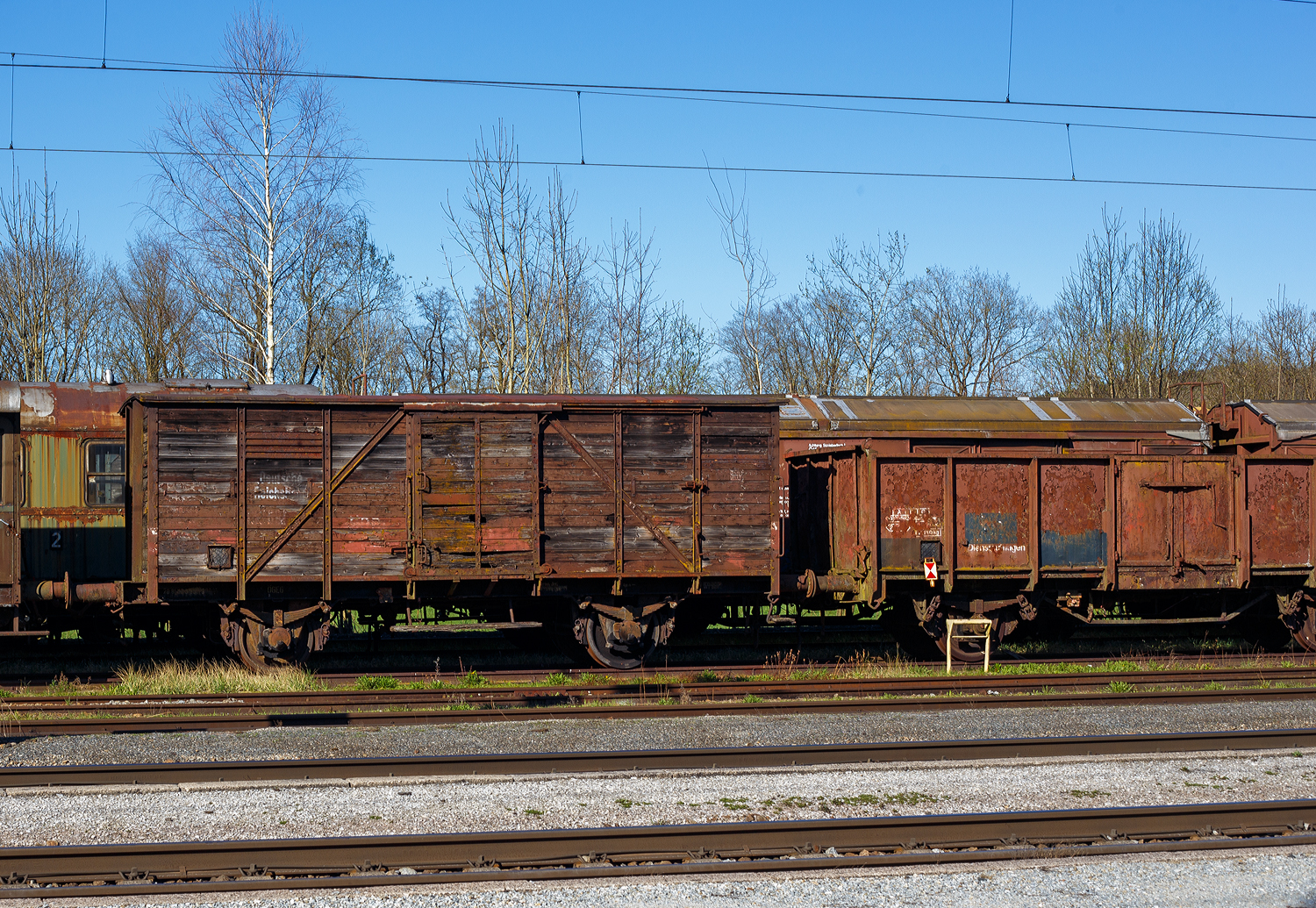 Flachgüterwagen der Reihe RS, (H-SWIVT 9732 129-8) beladen mit alten Holz Schwellen, im Gleisbauzug bei Enscherange eingereiht. 23.08.2023
