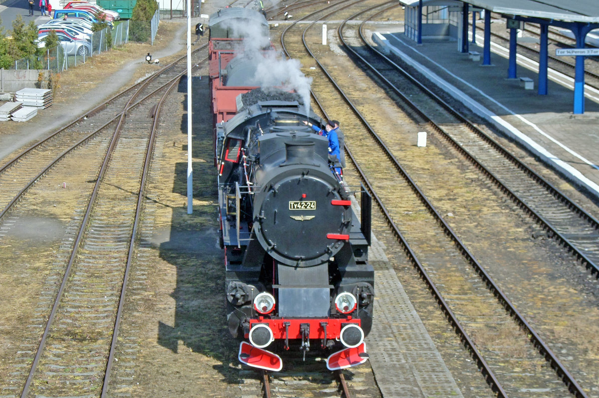 Ex-Kriegslok Ty42-24 steht mit ein Fotoguterzug am 30 April 2016 in Wolsztyn.