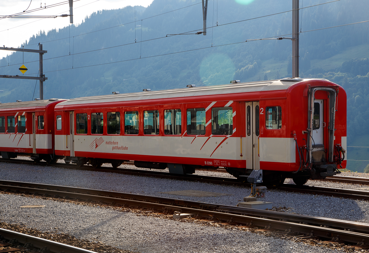 Der SIG EW I / Brünig Typ III zweite Klasse Personenwagen MGB B 2090, ex BVZ B 2090, ist am 07 September 2021 beim Bahnhof Disentis/Mustér abgestellt. Die SBB wählten für ihre einzige Schmalspurbahn, die Brünigbahn (heute Teil der Zentralbahn) nicht FFA, sondern SIG als Lieferantin der Einheitswagen. Deren Entwurf hielt sich äußerlich stärker an das normalspurige Vorbild, indem Plattform und Toilette außerhalb der Einstiege angesetzt wurden. Die Einstiegstüren wurden über den Drehgestellen angeordnet. Der Sitzteiler in der 2. Klasse ist mit 1.540 mm sogar noch geringer als beim FFA EW I ausgefallen. Der Beschaffung bei der SIG schlossen sich auch BOB und BVZ an. FO und die MOB, als einzige Adhäsionsbahn, verzichteten auf eine Endplattform, was den Wagen ein eigenartiges unsymmetrisches Aussehen gibt. So beschaffte zwischen 1968 und 1975 die BVZ (heute MGB) mit den A 2071-2078 bzw. B 2281-2290 insgesamt 18 neue Einheitswagen. Die Fahrzeuge sind eng verwandt mit den Einheitswagen Typ III der SBB Brünigbahn sowie den Wagen der BOB. Dank ihrer Vielfachsteuerleitung werden sie gemeinsam mit den Steuerwagen Bt 2251-2254 im Pendelzugdienst eingesetzt, häufig sind bzw. waren sie auch im "Glacier Express" anzutreffen. Zwei der Erstklasswagen wurden zwischenzeitlich mit einem Gepäckabteil bestückt und als AD 2077-2078 bezeichnet. Nach der Fusion der BVZ mit der FO zur Matterhorn Gotthard Bahn (MGB) wurden Modifizierungen an der Belüftung durchgeführt und zusätzliche Aggregate auf dem Dach montiert. Da die Wagen für den Einsatz auf Zahnradbahnen konzipiert sind, wurde möglichst gewichtssparend gebaut. Es gibt (außer früher bei den Brünig AB) nur ein WC. Der Kasten ist aus Aluminium. Technische Daten: Baujahr: 1975 (1997 Umbau) Spurweite: 1.000 mm Länge über Puffer : 18.070 mm Wagenkastenlänge: 17.300 mm Drehzapfenabstand: 12.830 mm Drehgestelle: SIG-66 mit Bremszahnrad Eigengewicht: 13,4 t Sitzplätze: 64 in der 2. Klasse Zul. Höchstgeschwindigkeit: 90 km/h Zugelassen für Netz der: MGB und RhB