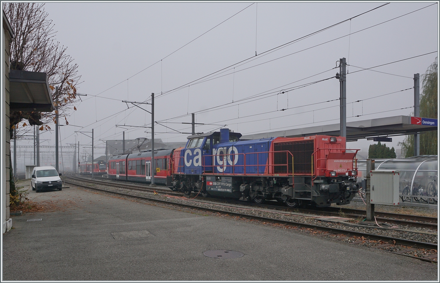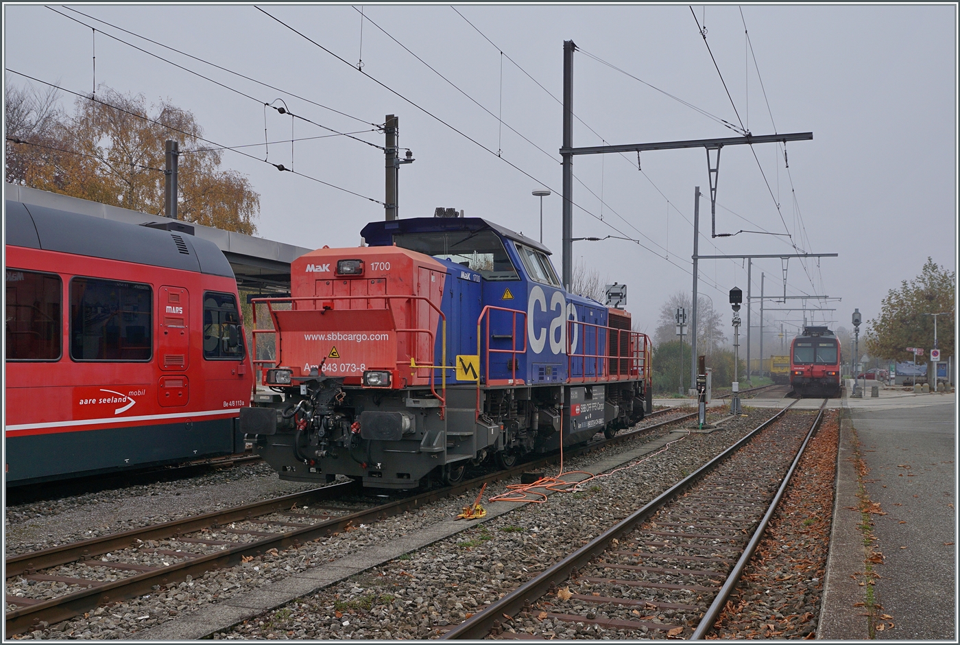 Die SBB Am 843 022-5 ist in Martigny mit dem Rangieren von Gleisebau-Güterwagen beschäftigt.