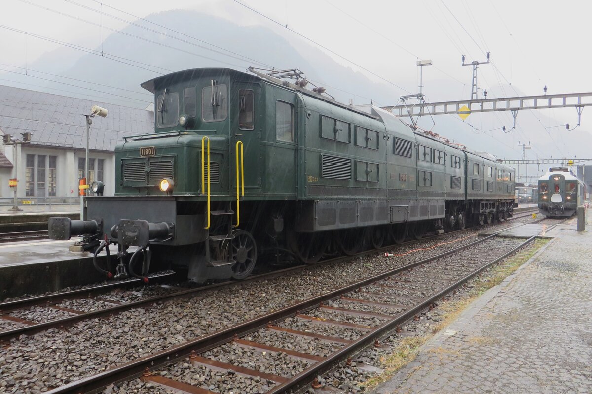 Am ganz verregneten 19 september 2019 steht 11801 in Erstfeld während der bis heute leider einzige Edition vons Bahnhofsfest  Bahnen am Gotthard .