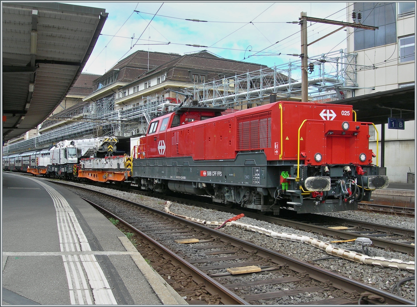 Die SBB Aem 940 025 (Aem 91 85 4 940 025-0 CH-SBB I) wartet mit dem mächtigen Rhomberg Sersa KRC 1200 Kranwagen (CH RSRM99 85 9219 102-2) und zwei Begleitwagen (33 85 4505 172-8 TEN-CH WASCO Sgmmns und 33 85 4505 173-6 TEN CH-WASCO Sgmmns) in Lausanne auf die Weiterfahrt.