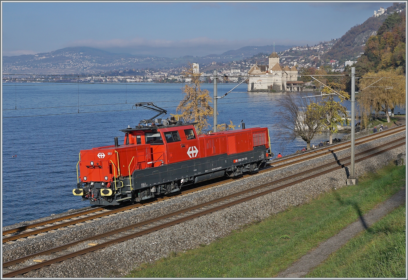 Die SBB Aem 940 051 (UIC Aem 91 85 4 940 051-6 Ch SBB I) ist kurz nach Villeneuve auf dem Weg in Richtung Lausanne. Im Hintergrund ist das Château de Chillon zu sehen. 15. Nov. 2024