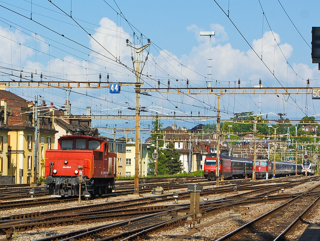 Am 29.05.2012 am Bahnhof Lausanne, halbrechts steht die SBB Ee 934 553-0 (ex Ee 3/3 IV - 16 553), rechts weiter hinten ein paar Abstellgruppen.