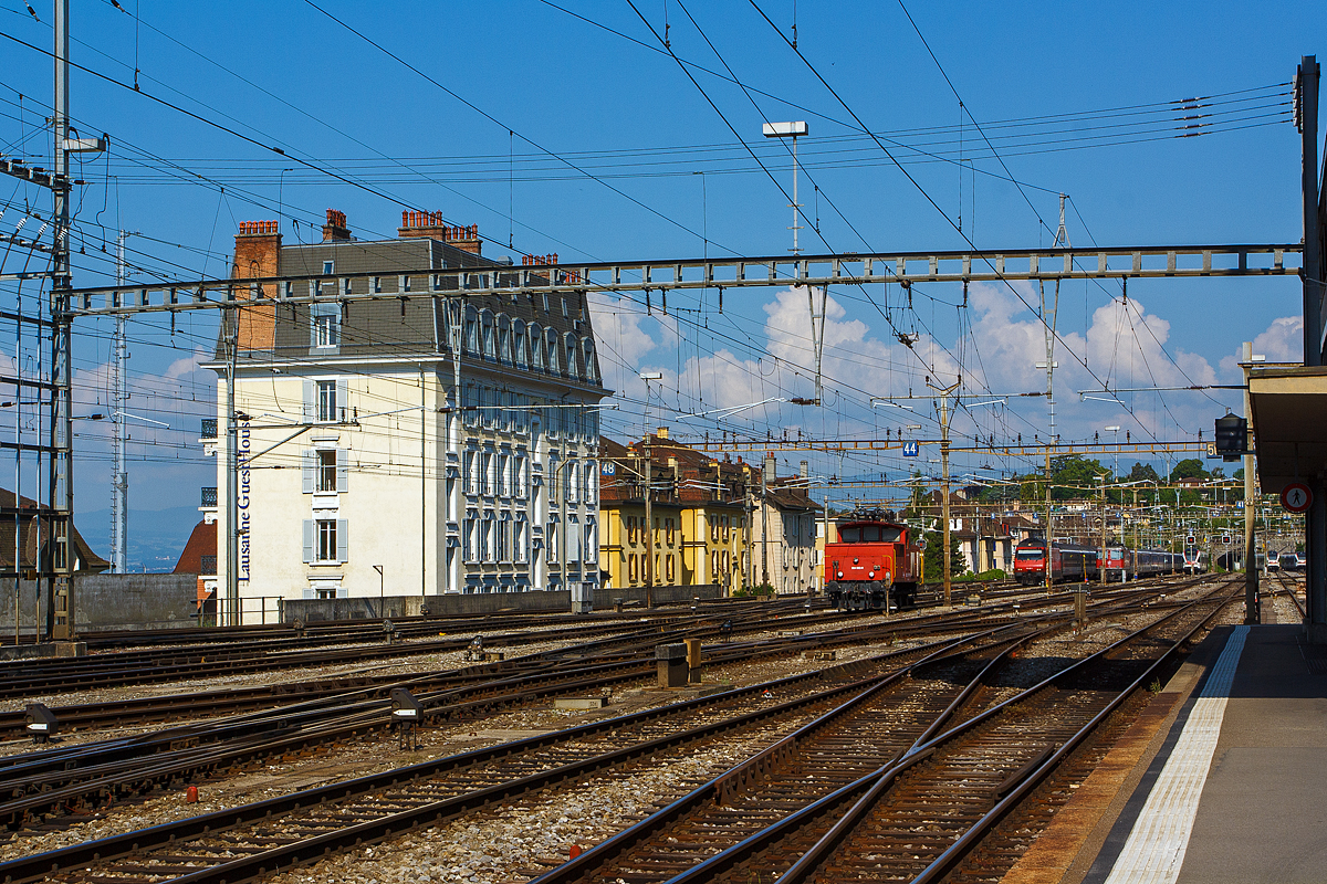 Am 29.05.2012 am Bahnhof Lausanne, links ist die SBB Ee 934 553-0 (ex Ee 3/3 IV - 16 553) abgestellt, rechts ein paar Abstellgruppen. Die Ee 3/3 IV ist eine 4-Stromsystem-Lok (15 kV 16,7 Hz AC, 25 kV 50 Hz AC, 3 kV DC und 1,5 kV DC), diese komplizierte Technik erforderte höhere und breitere Aufbauten vor und hinter dem Führerstand und führte zu niedrigerer Leistung (390 kW / 530 PS). Zugleich konnte dank des moderneren Kuppelstangenantriebs die Höchstgeschwindigkeit auf 60 km/h angehoben werden. Insgesamt wurden 10 dieser Loks 1962-1963 bei SLM/SAAS gebaut.