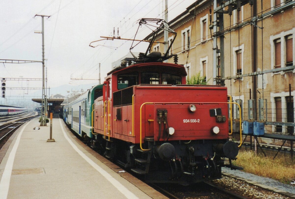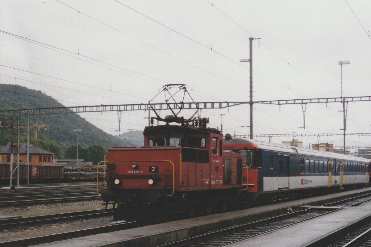 Scanbild von vorbeie sachen: am 20 Juni 2001 rangiert 934 558 ein SBB Regionalzug in CHiasso. Die 934 und die Kolibri-Fraben der EW-II sind alle verschwunden.