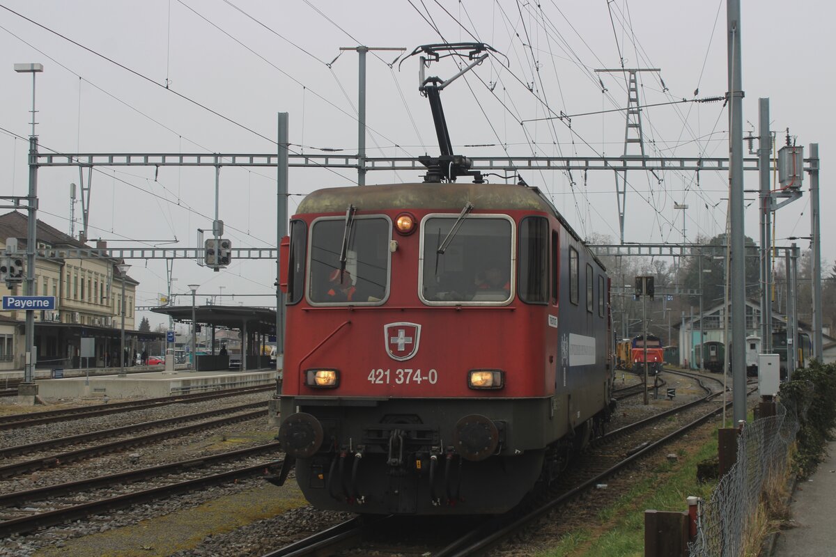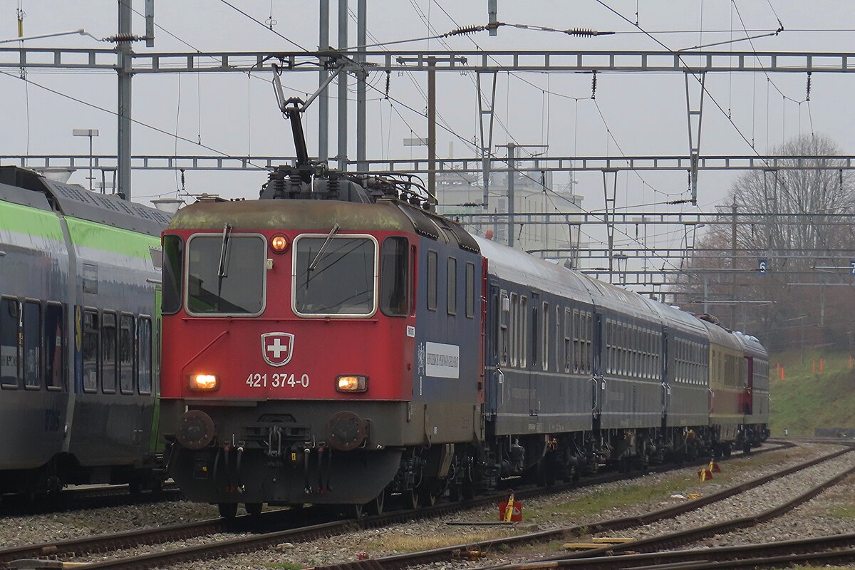 SBB: Postzug in zu den Postcontainern passenden Umgebung bei Niederbipp mit einer Re 421 auf der Fahrt nach Härkingen am 3. Mai 2016.