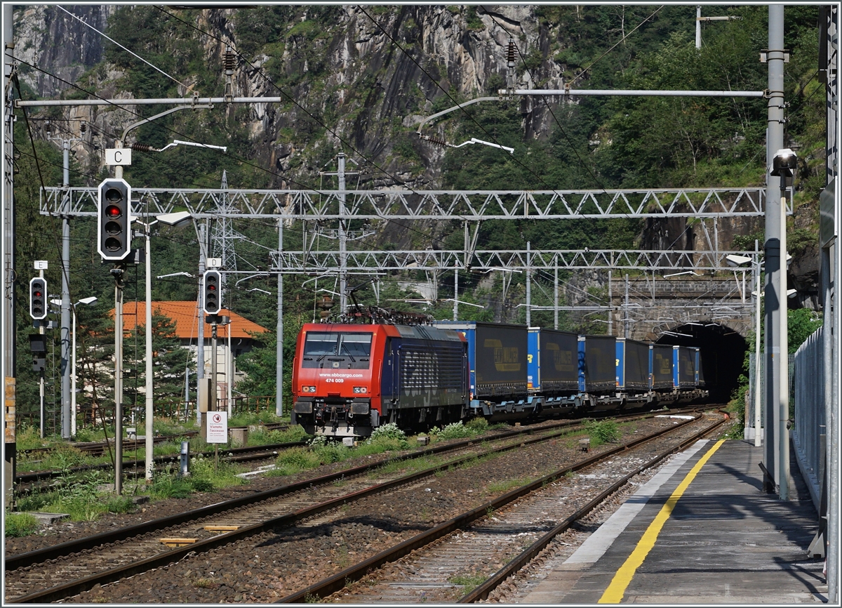 Die SBB Re 474 009 schiebt in Iselle einen Güterzug Richtung Brig nach. Der im Hintergrund zu sehende Tunnel ist noch nciht der Simplontunnel, der folgt erst ein paar hundert Meter weiter nördlich. Die Eigentunmsgrenze SBB / FS befindet sich jedoch im zu sehenden Iselle-Tunnel.