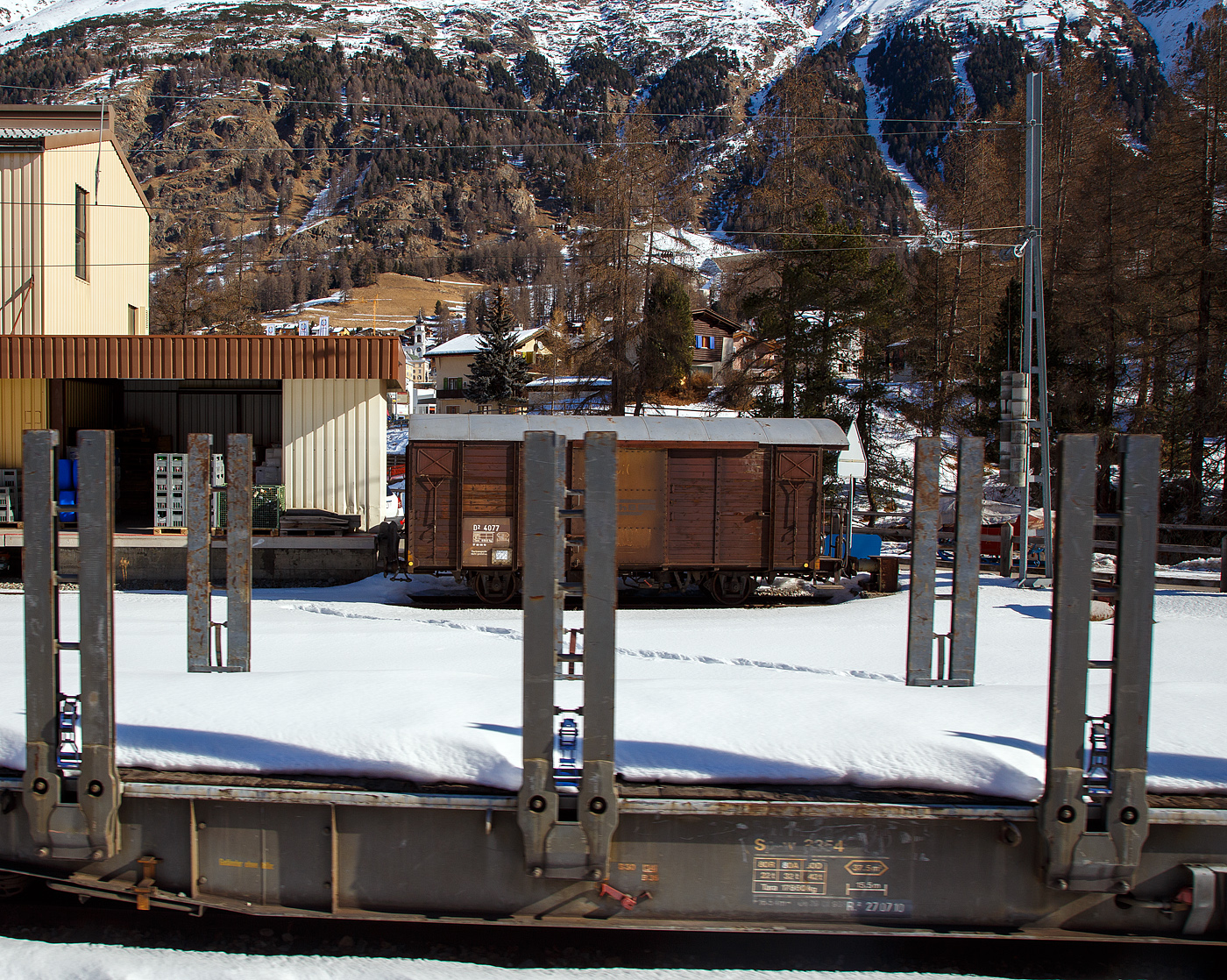 Über einen modernen Flachwagen hinweg, der zweiachsiger gedeckter Güterwagen mit Bremserplattform RhB D² 4077 (Baujahr 1913, ein ex Gbk-v 55xx, ex K1 55xx) am 20 Februar 2017 abgestellt im Bahnhof Pontresina.