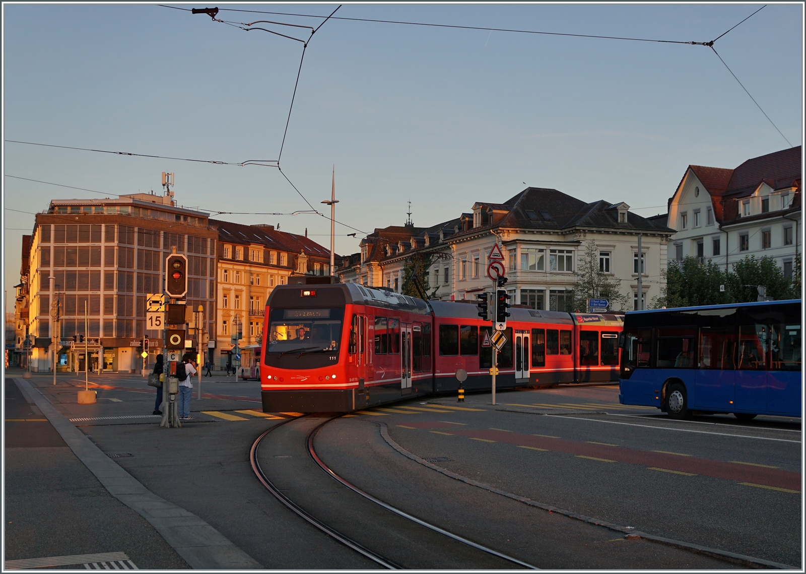 Der ASM Be 4/8 112 beim halt in Aarwagne Schloss, dessen Turm im Hintergrund zu sehnen ist.