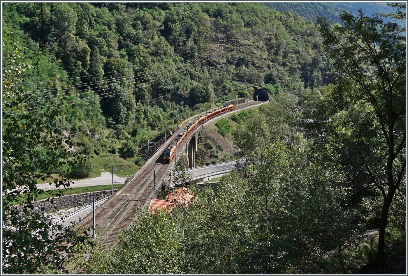 Ein SOB TRAVERSO RABe 526 fährt als  Treno Gottardo  über die 103 Meter lange Polmengobrücke, und wird gleich darauf in den  1567 Meter langen Pratotunnel, der als 360 ° Kreiskehrtunnel ausgeführt ist fahren und somit gut 40 Meter Höhenunterschied gewinnen.